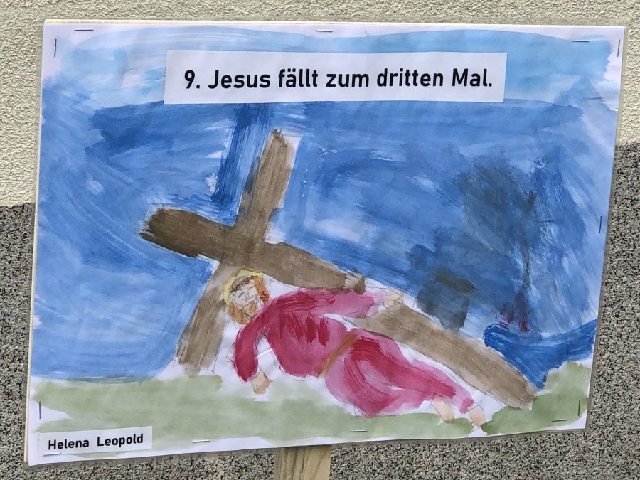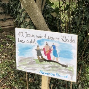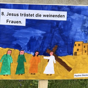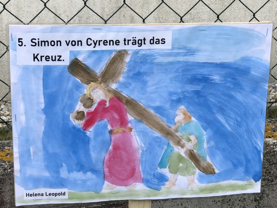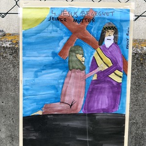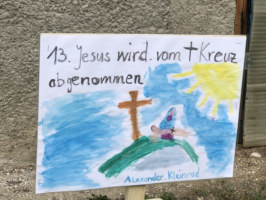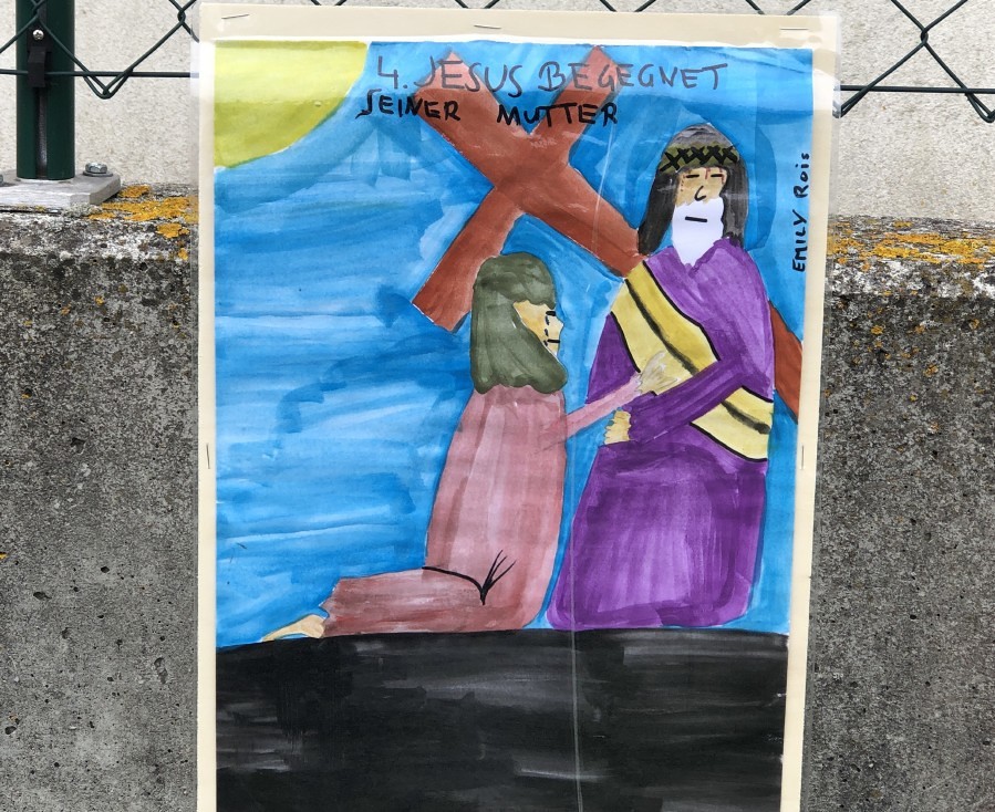 In diesem Jahr haben die Erstkommunionskinder den Kinderkreuzweg selbst gestaltet. Jedes Kind durfte zwei Stationen gestalten. Mit den Eltern haben sie sich in das Thema vertieft. Daraus entstanden wunderschöne Kunstwerke. Diese visualisierten den Leidensweg Jesu nochmal gut.
