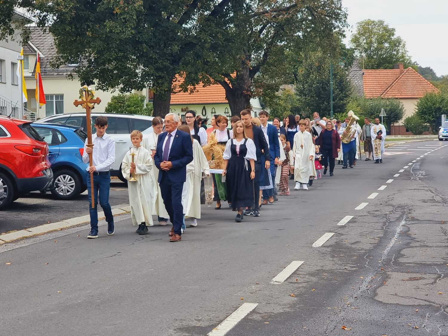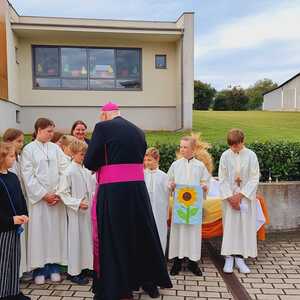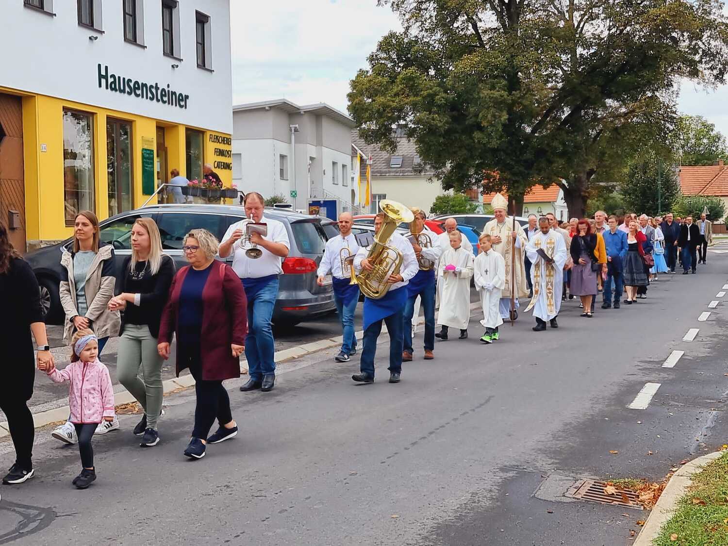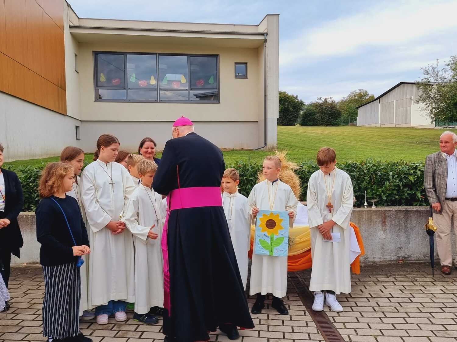 Das Kirchenvolk versammelte sich beim Pfarrhof, wo Herr Diözesanbischof Ä. Zsifkovics von den Kindern feierlich begrüßt wurde. Nach der Segnung der Erntekrone führte ein langer Festzug, angeführt vom Kreuz mit den Ministranten und der Blaskapelle Kirchschlag zum Gotteshaus, wo unser Herr Bischof dann die Segnung vornahm.