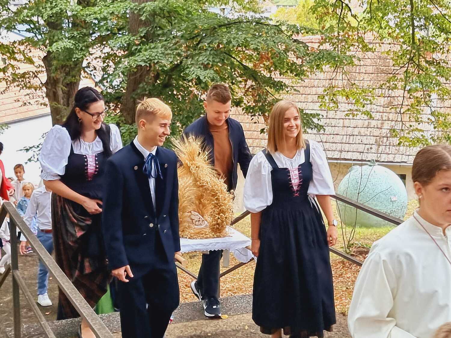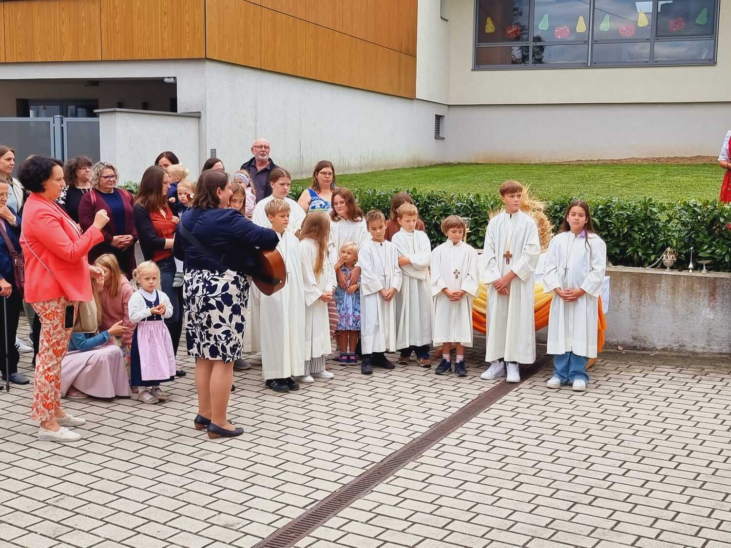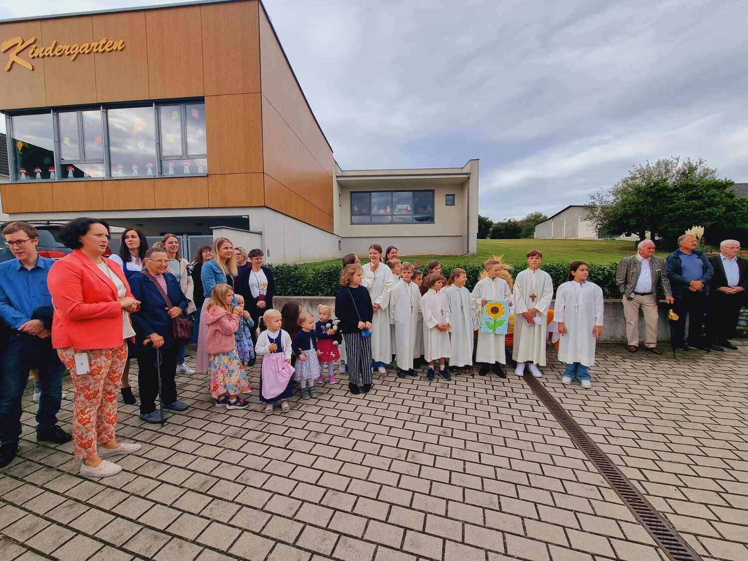 Das Kirchenvolk versammelte sich beim Pfarrhof, wo Herr Diözesanbischof Ä. Zsifkovics von den Kindern feierlich begrüßt wurde. Nach der Segnung der Erntekrone führte ein langer Festzug, angeführt vom Kreuz mit den Ministranten und der Blaskapelle Kirchschlag zum Gotteshaus, wo unser Herr Bischof dann die Segnung vornahm.