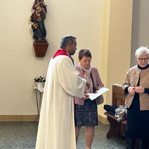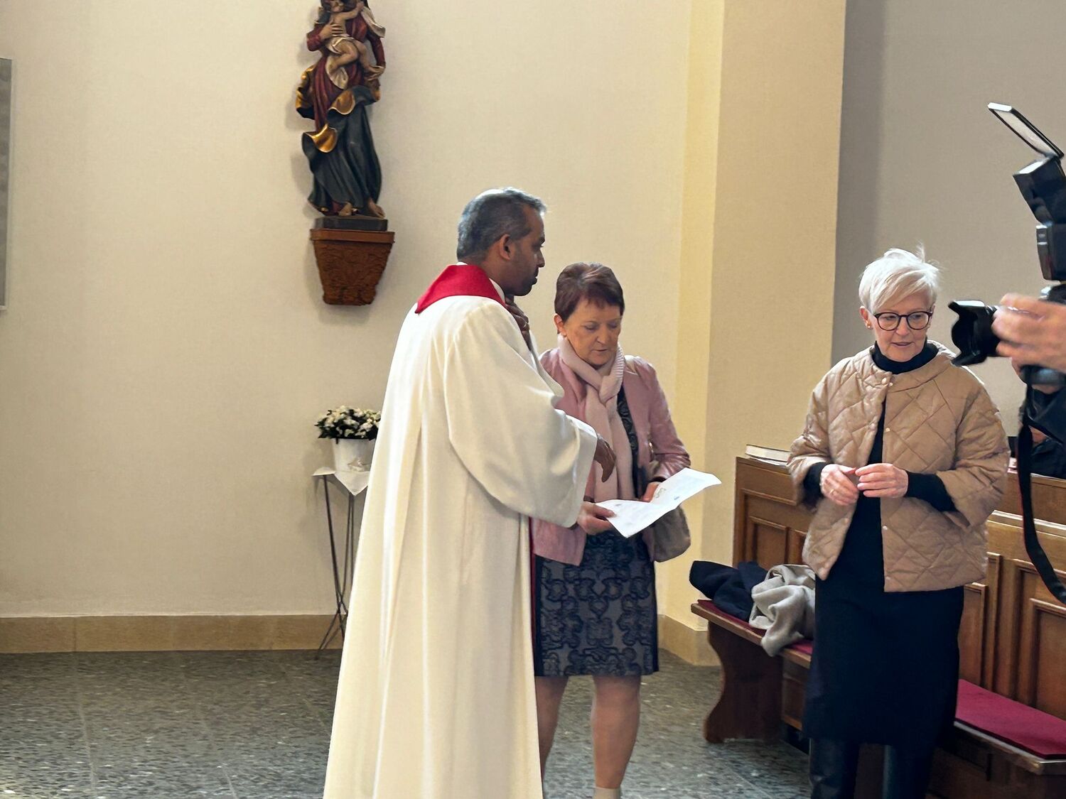 Im Anschluß gab es eine Begegnung mit allen Pfarrgemeinderäten des Pfarrverbandes. Kuratorin Frau Elisabeth Schefberger fasste in einem Bericht die gemeinsame Arbeit der letzten 4 Jahre mit Pfarrer Shinto zusammen. Ergänzend wurde von der Kuratorin Frau Gerda Grill der Abschlußbericht der Kirchenrenovierung Lackenbach präsentiert. Filialvertreter Herr Erwin Giefing berichtete von der Renovierung der Filialkirche Tschurndorf.