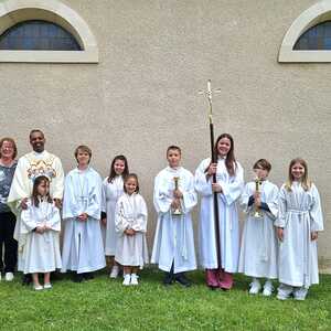 Am Samstag den 03.05.2025 um 10 Uhr war es dann soweit, der große Tag war gekommen und in Begleitung von Familie, Freunden und der Jugendmusik zogen die Kinder mit ihren Taufpaten und Taufpattinnen in die Kirche ein. Wie immer war diese besonders schön geschmückt, ein wunderschönes Holzkreuz mit Namen der Erstkommunionkinder zierte den Altar.