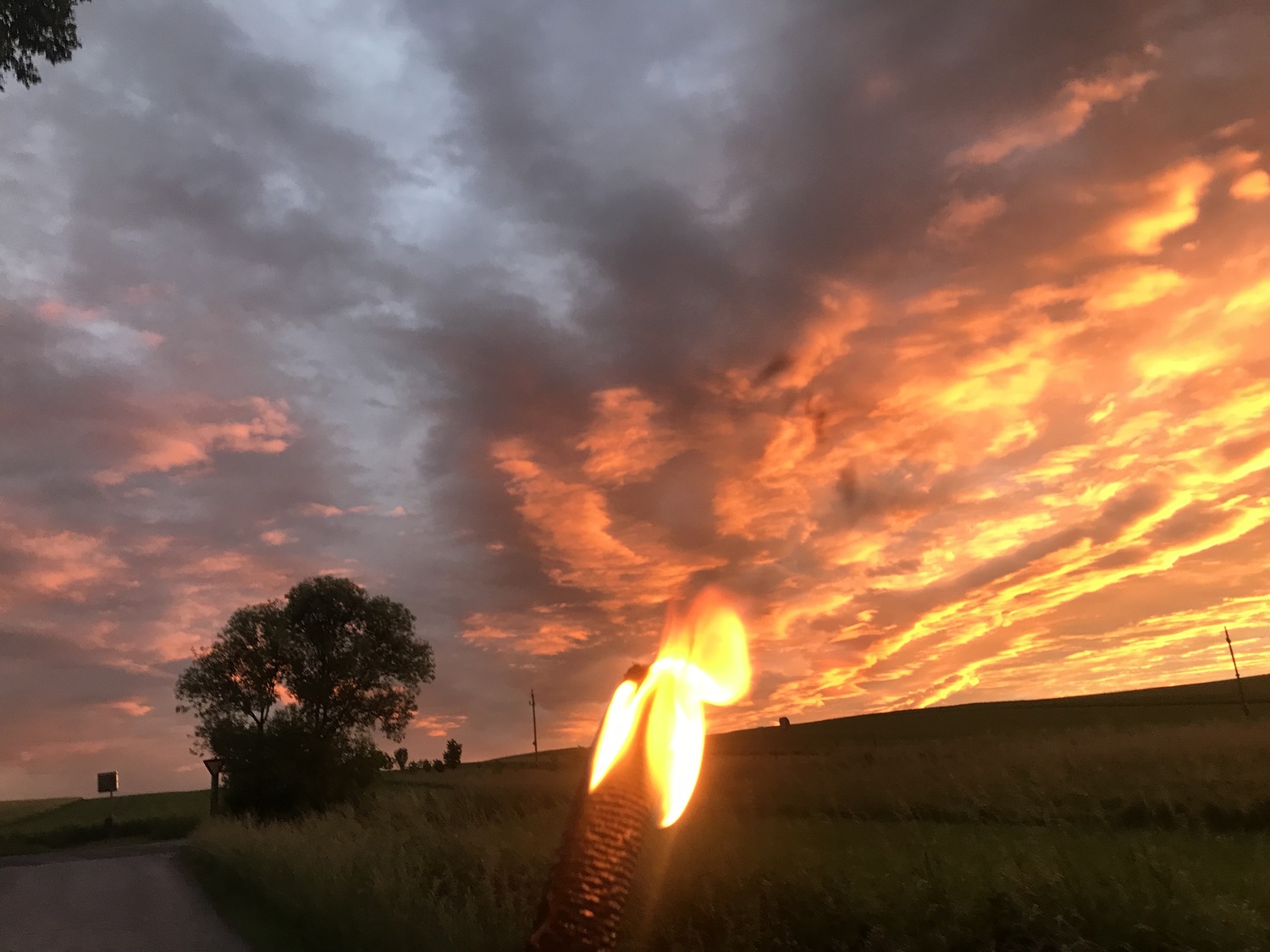 Passender hätte die Abendstimmung für die Fackelwanderung zum Thema „Feuer und Flamme“ nicht sein können. Man hatte das Gefühl, der Himmel brennt mit den Fackeln mit.