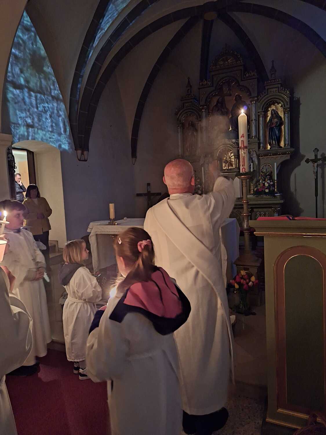 In der Osternacht bricht die Stille durch den erlösenden Ruf, dass Christus als das Licht der Welt immer gegenwärtig ist. Der Stein am Eingang des Grabes ist weg, das Grab ist leer – ER LEBT!