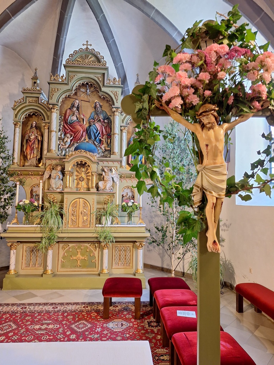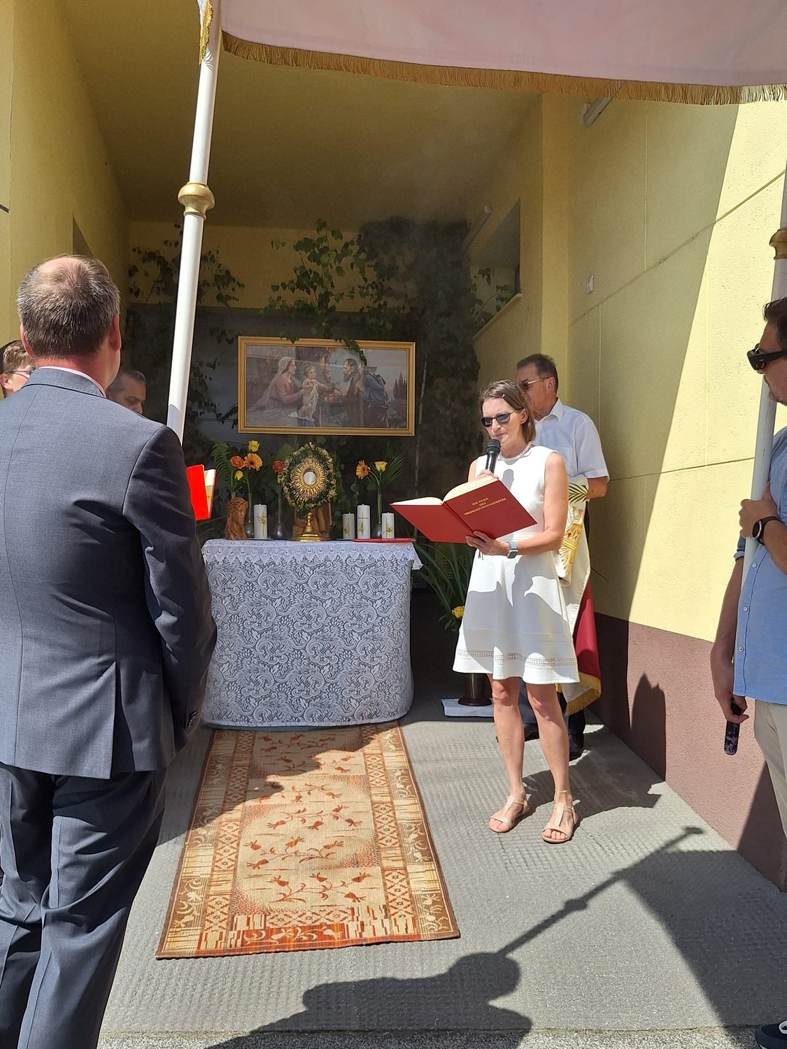 Im Anschluss an die Messe zog die Gemeinde in einer feierlichen Prozession mit dem Allerheiligsten durch die Straßen unseres Ortes. Der Weg führte zu vier festlich geschmückten Altären, die von engagierten Gemeindemitgliedern liebevoll vorbereitet worden waren. An jedem Altar wurde das Evangelium verkündet, Fürbitten gehalten und der sakramentale Segen gespendet.