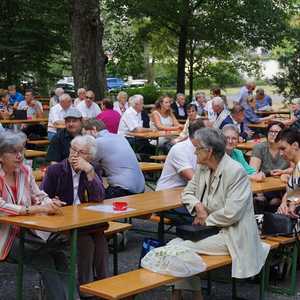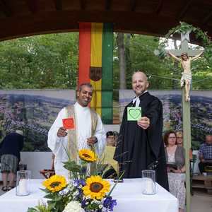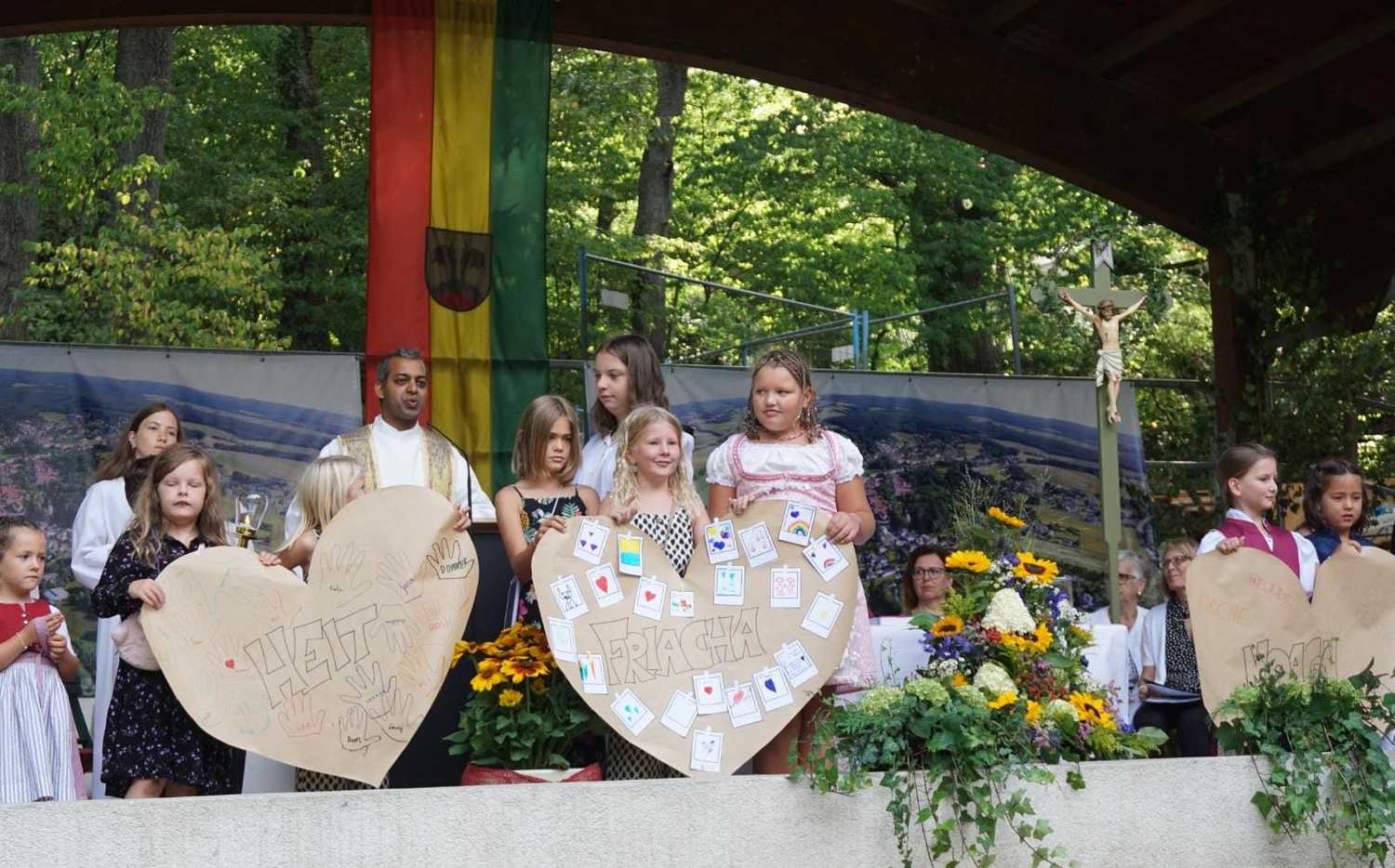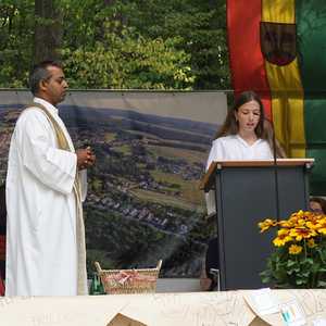 Die 800-Jahr-Feier, die am 14. August begangen wurde, war ein gelungenes Fest, zeigte sich doch das Wetter von seiner besten Seite. Begonnen wurde der Tag mit einem ökumenischen Festgottesdienst mit Hr. Pfarrer Stefan Grauwald und unserem Hr. Pfarrer Shinto Michael. Mitgestaltet wurde die Feier von den Kindern, die außerhalb der Kirche einen Kinderwortgottesdienst feierten und dann mit ihren selbstgestalteten Herzplakaten dazu kamen. Als kleine Erinnerung verteilten die Kinder am Ende des Festes selbstgebastelte Herzen mit dem Bibelspruch zum heutigen Evangelium Joh. 15,12: "Liebt einander, so wie ich euch geliebt habe."