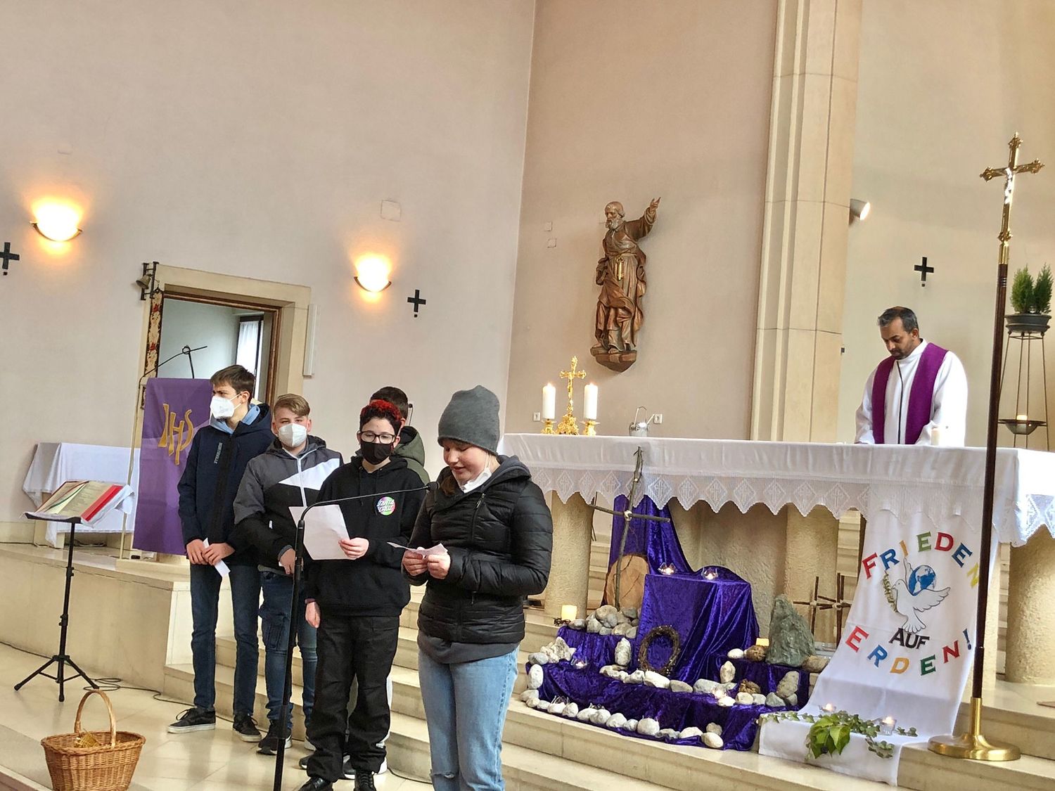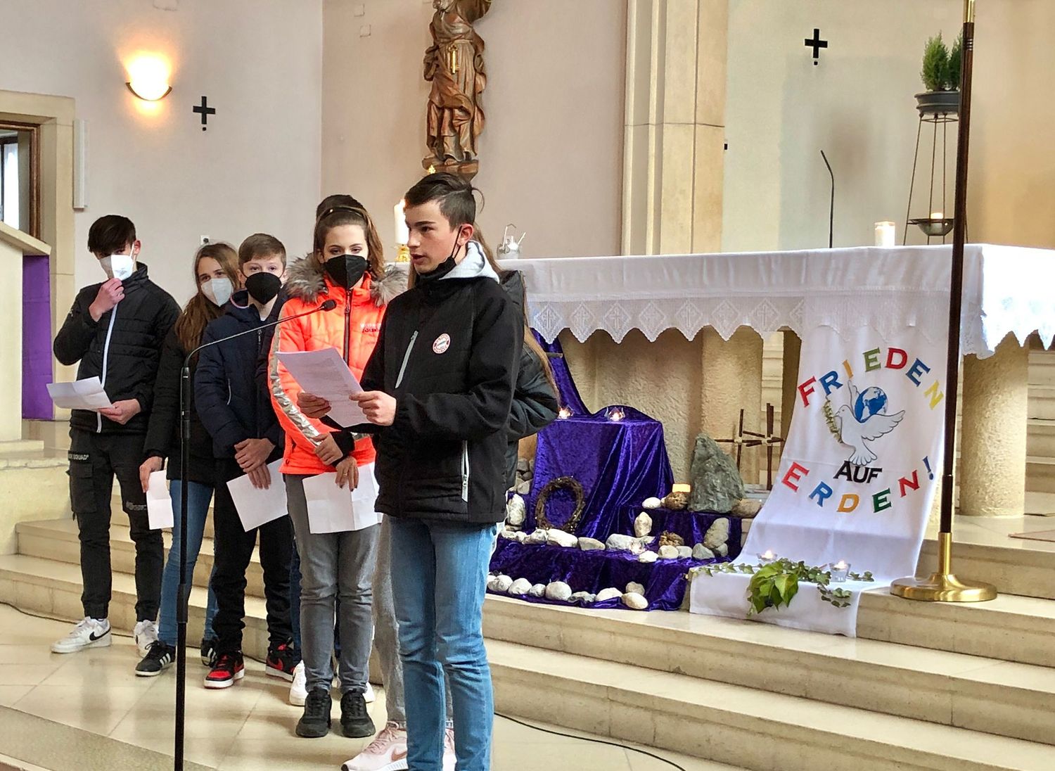 Die Jugendlichen versuchten herauszufinden, welchen Weg Christus heute geht. Bei jeder Station gaben uns die Firmlinge Impulse, was der Kreuzweg Jesu für uns und unsere Zeit bedeuten kann und wie der Kreuzweg Jesu auch zu unserem Kreuzweg wird.