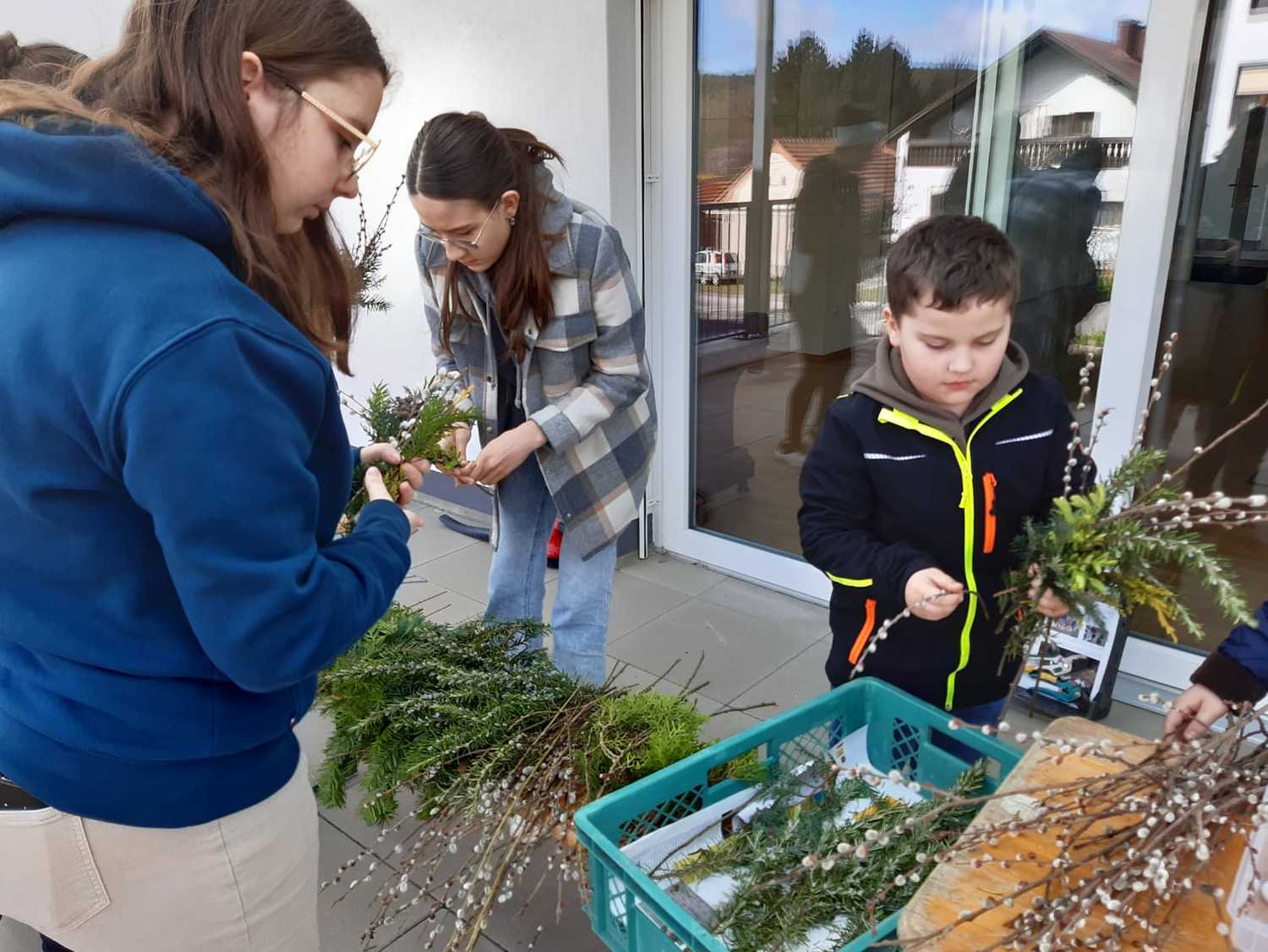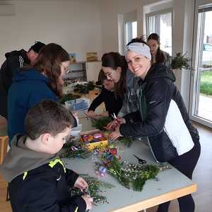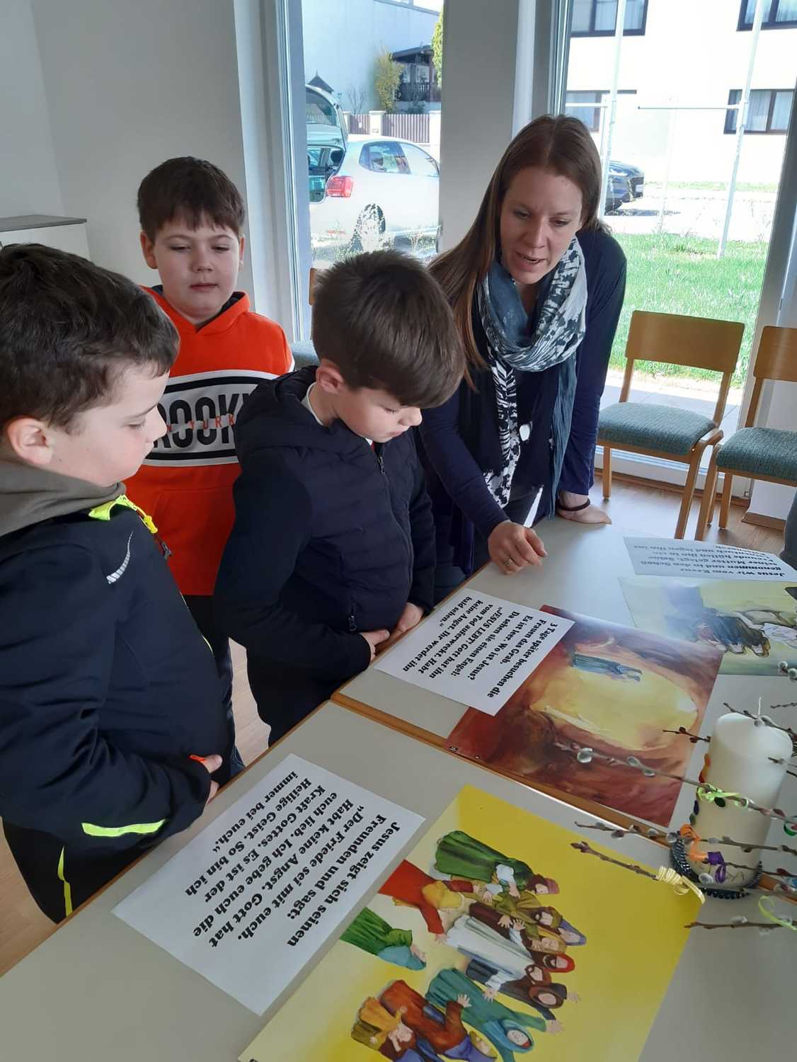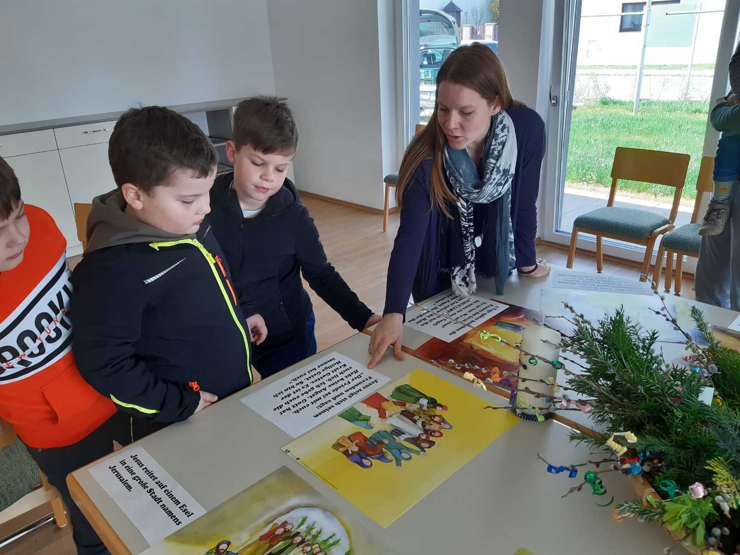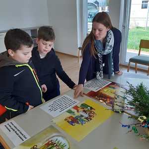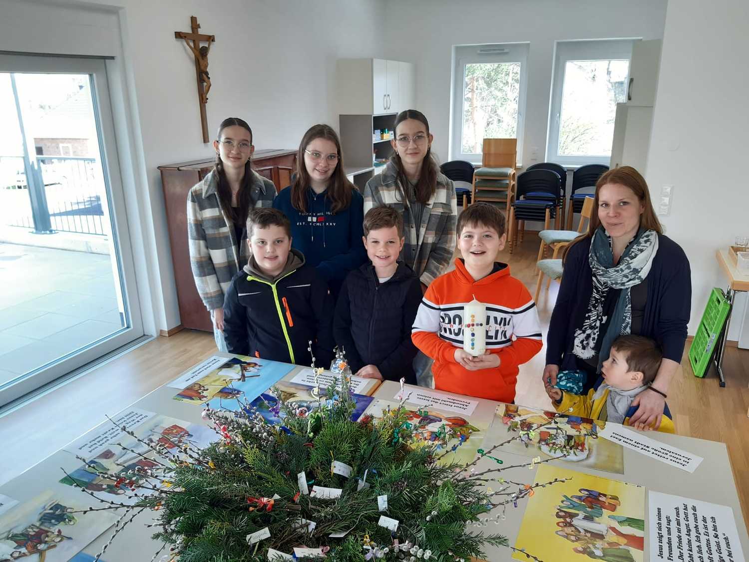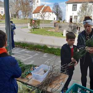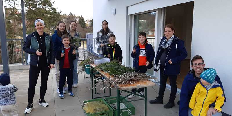 Damit auch wir unsere Freude zeigen können und so wie die Menschen damals Jesus begrüßen können, haben die Kinder unter Anleitung von Jungscharleiterin Katja und Tischmutter Carina wunderschöne Palmbuschen mit den Kindern gebunden. Gemeinsam wurde auch eine Kerze für den Pfarrhof gebastelt und die Fenster des Pfarrhofes wurden mit Bildern und Texten der Karwoche geschmückt.