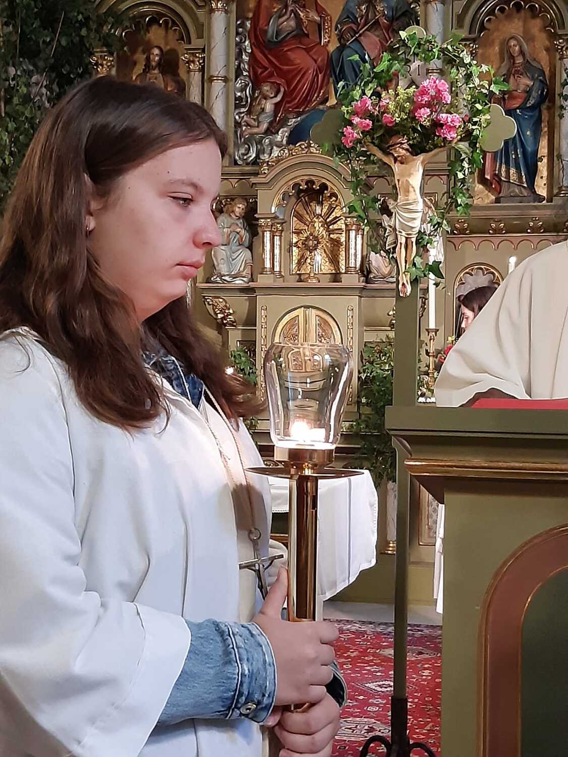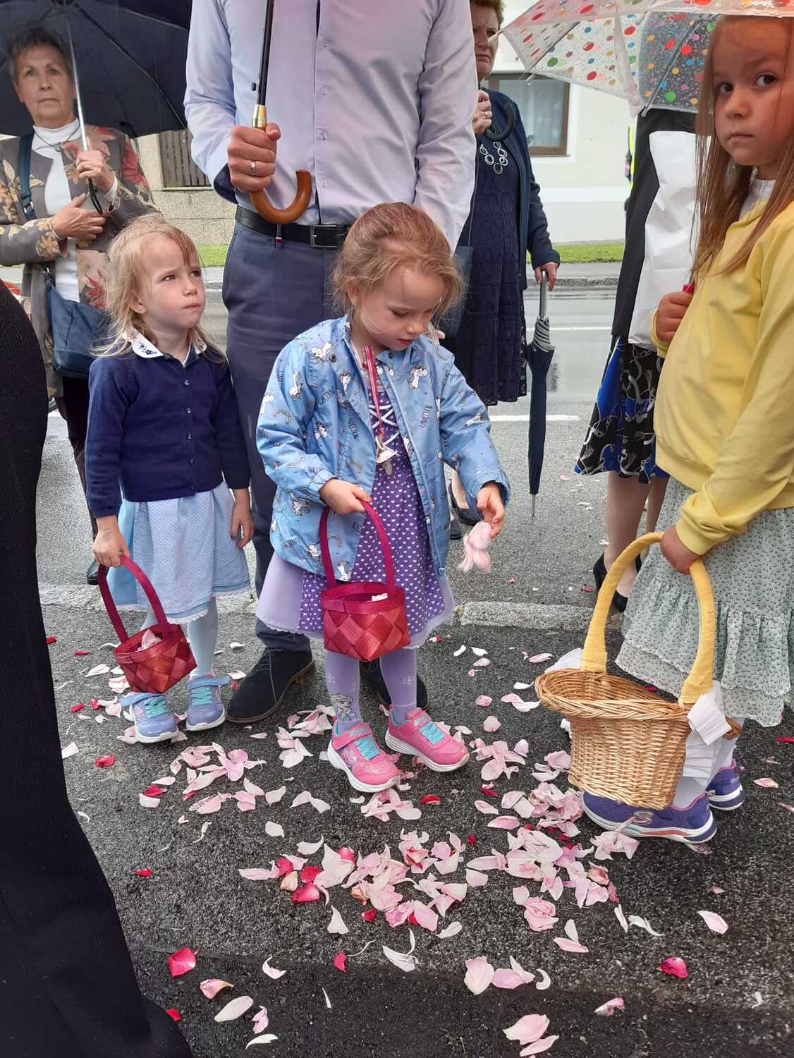 Der Ablauf des Festes musste jedoch wegen des schlechten Wetters kurzfristig geändert werden. Die 1. Station wurde in der Kirche gebetet. Der Weg zum naheliegenden Pfarrheim, wo die 2. Station war, wurde trotz Regen auf sich genommen. Eine besondere Freude hatten die Kinder, die auch ihre Blumen streuen konnten. Die Ministranten und die Erstkommunionkinder haben an beiden Stationen das Vortragen der Fürbitten übernommen.