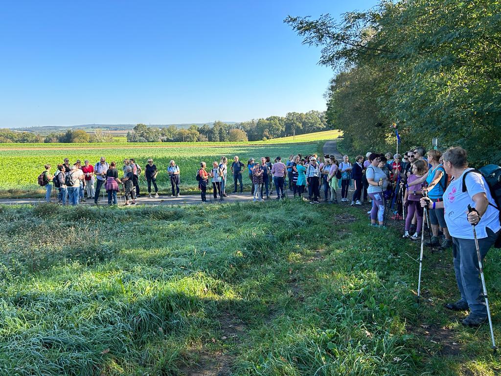 Mit diesem Gebet, mit dem gesegneten Pilgerstab und den Segen Gottes, erteilt von Pf. Shinto, machten sich 53 Frauen und 4 Männer auf den Weg um ca. 10 km bei strahlendem Sonnenschein, am Fuße der Landseer Berge zu pilgern.