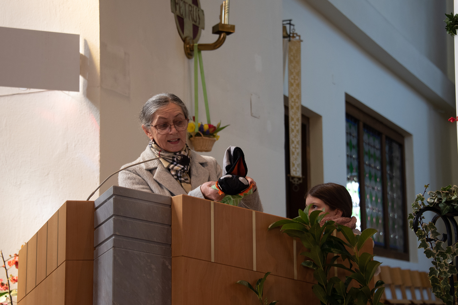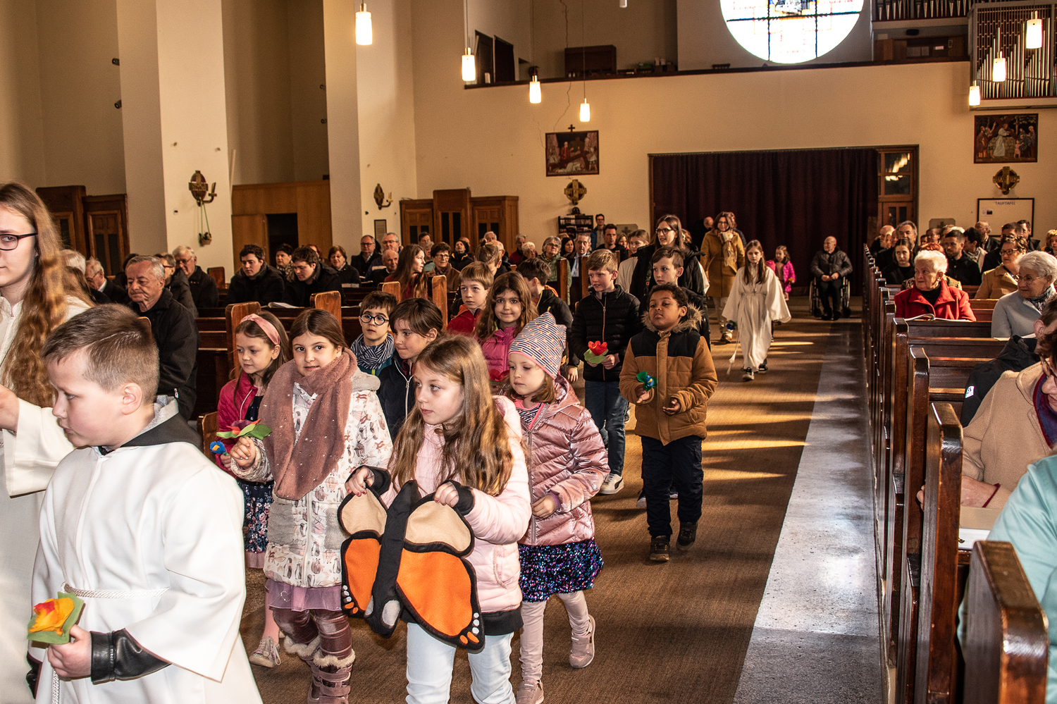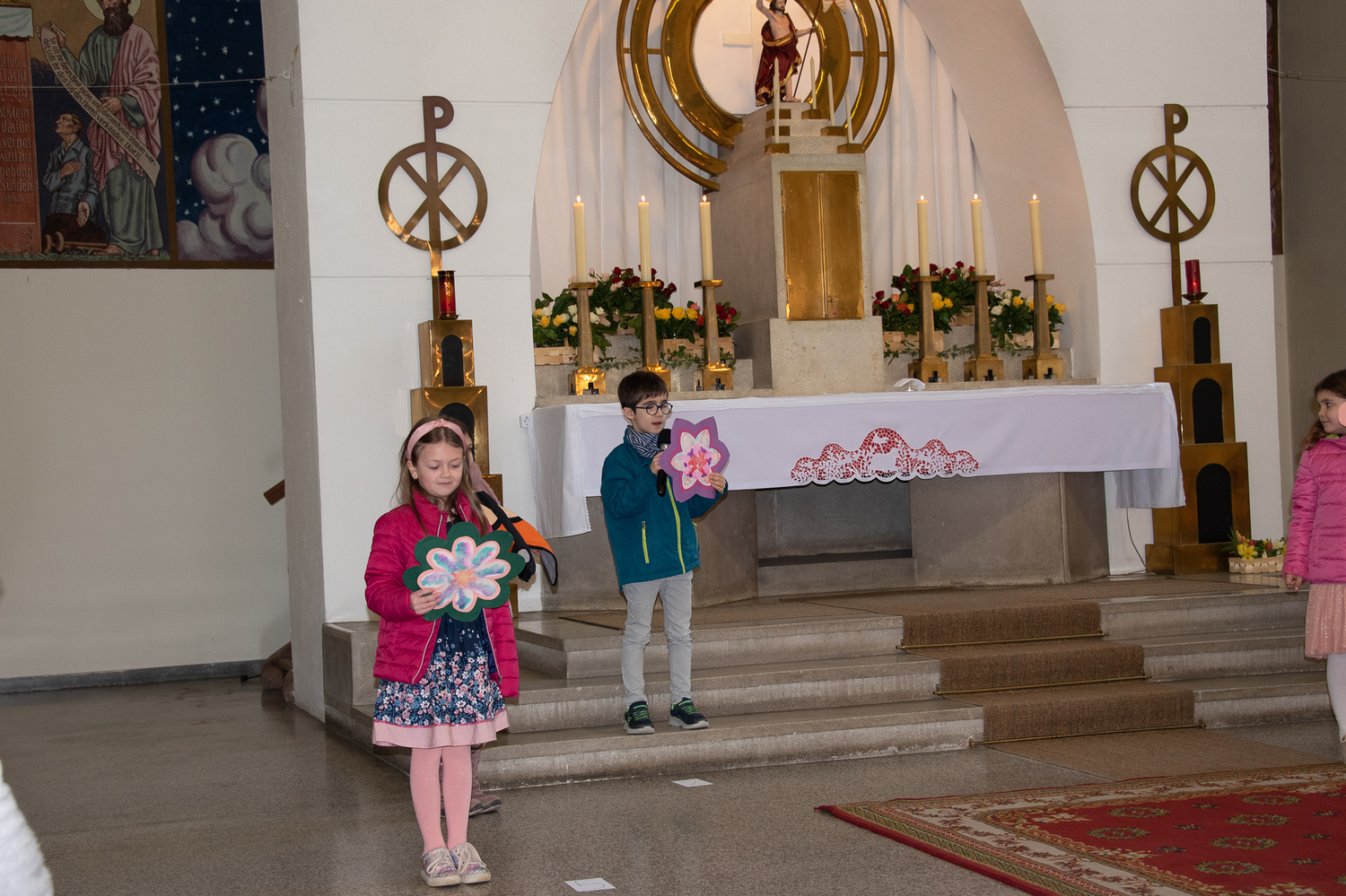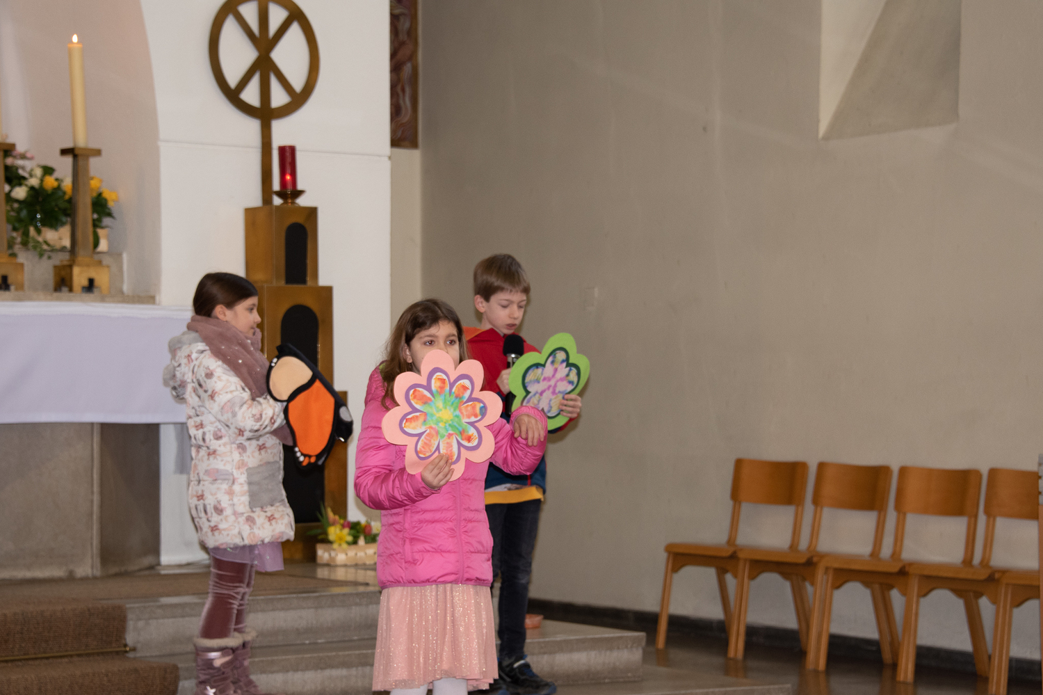In der Familienmesse am Ostermontag steckten die Kinder alle Gottesdienstbesucher mit ihrer Freude an. Dazu trugen auch die Lesungen von der Verwandlung der Emmaus-Jünger, die Geschichte von Raupe und Schmetterling und besonders die Prozession durch die Kirche bei. Die Lieder wurden von der Musikgruppe Arabesque wieder so fröhlich und wunderschön gesungen.