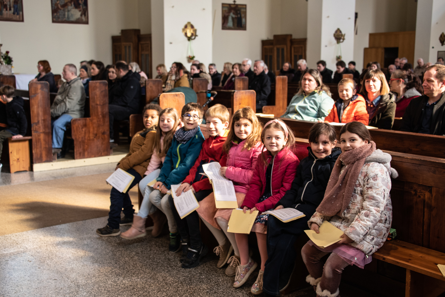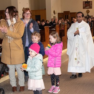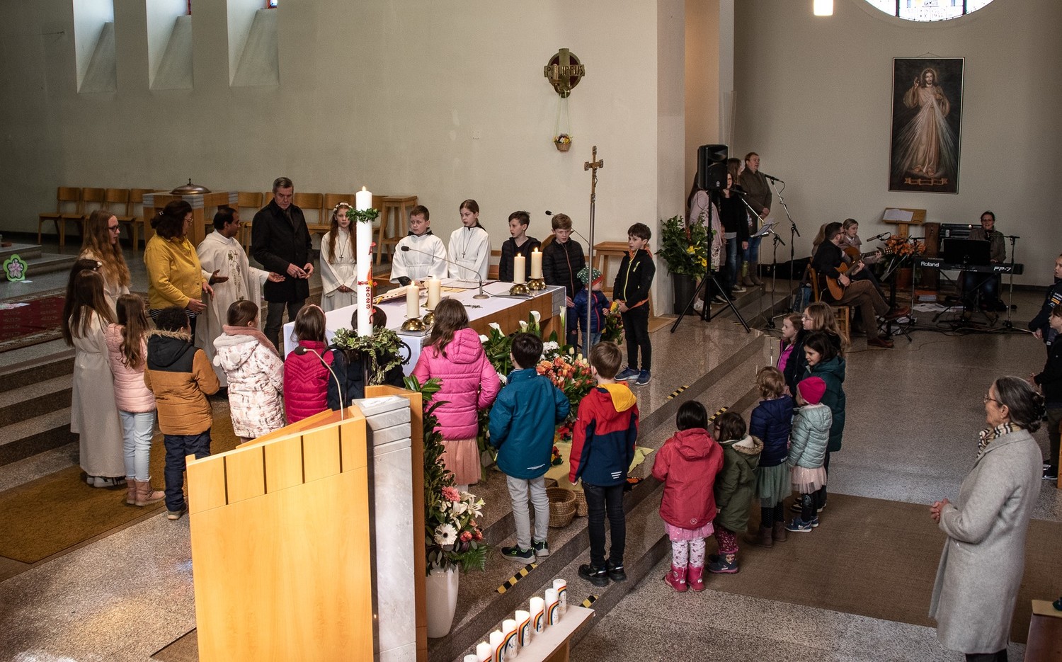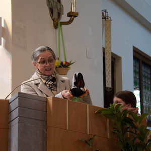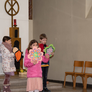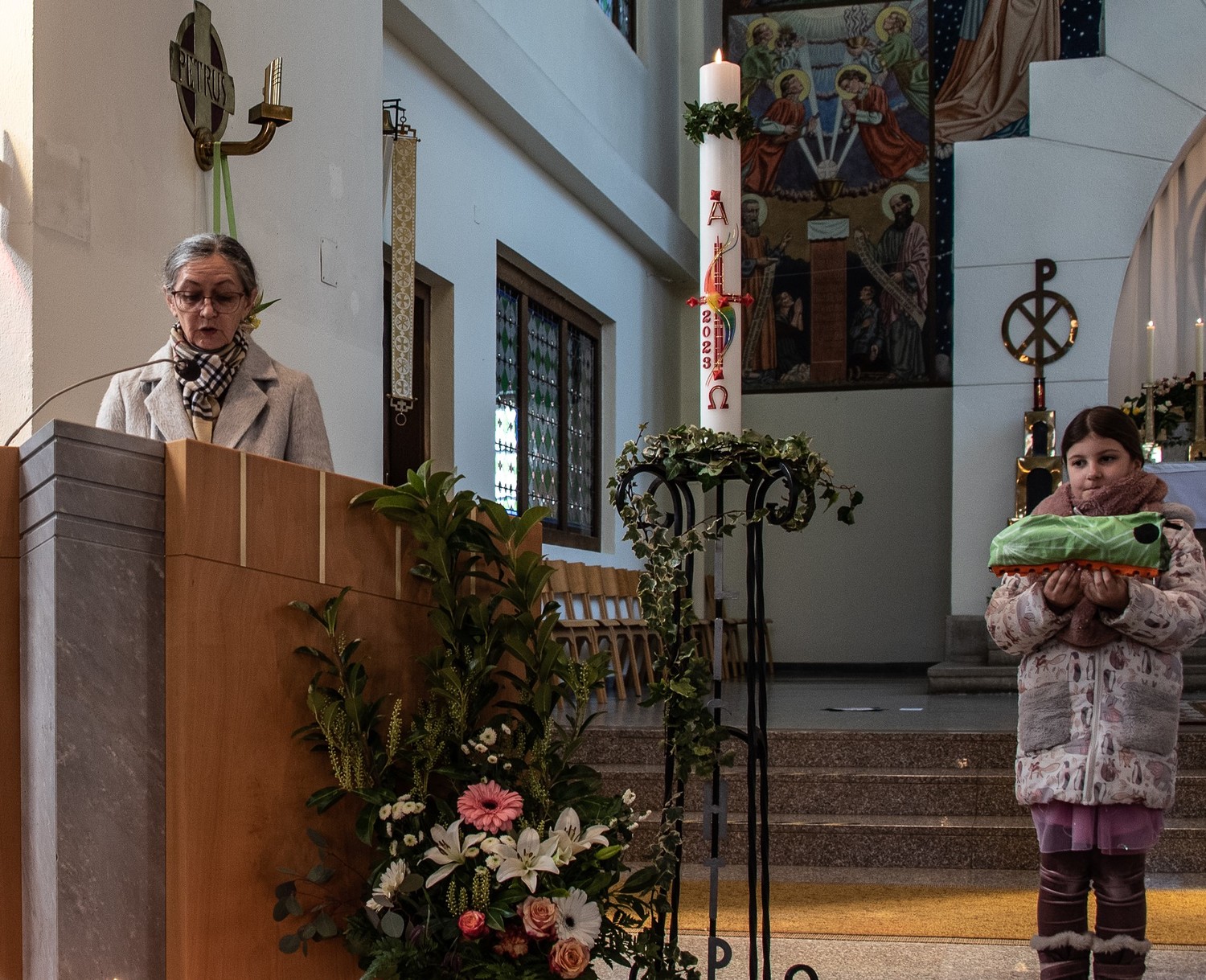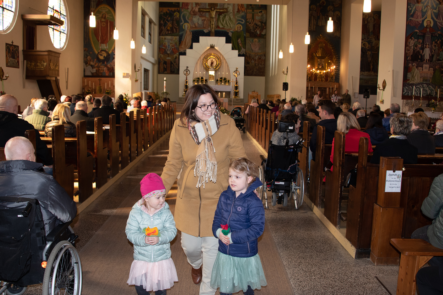 In der Familienmesse am Ostermontag steckten die Kinder alle Gottesdienstbesucher mit ihrer Freude an. Dazu trugen auch die Lesungen von der Verwandlung der Emmaus-Jünger, die Geschichte von Raupe und Schmetterling und besonders die Prozession durch die Kirche bei. Die Lieder wurden von der Musikgruppe Arabesque wieder so fröhlich und wunderschön gesungen.