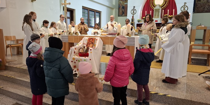 Beim gemeinsamen Vaterunser um den Altar gebetet haben alle Kinder eine gemeinsame Krone gebildet. Diese zeigte, dass alle seit der Taufe Königskinder, ja Könige und Königinnen sind.