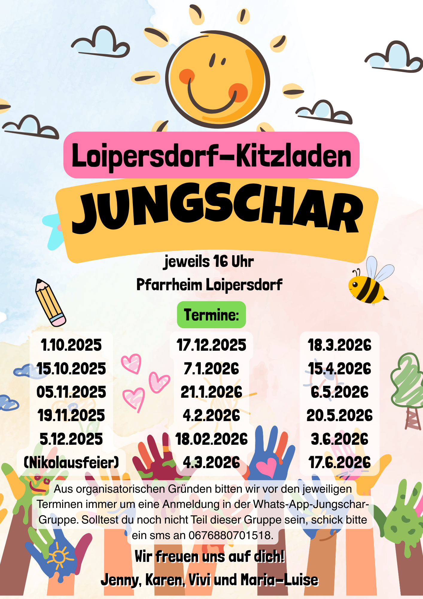 Aus organisatorischen Gründen bitten wir vor den jeweiligen Terminen immer um eine Anmeldung in der WhatsApp-Jungschargruppe. Solltest du noch nicht Teil dieser Gruppe sein, schick bitte ein sms an 0676880701518.