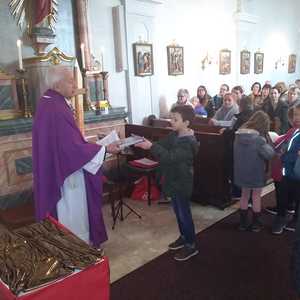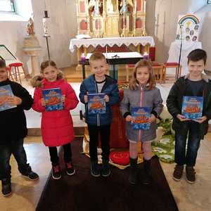 Am 8. März fand in Jabing die Bibelübergabe an die Erstkommunionkinder statt. Armin, Isabella, Leon, Max und Sarah freuen sich über ihre Kinderbibel.