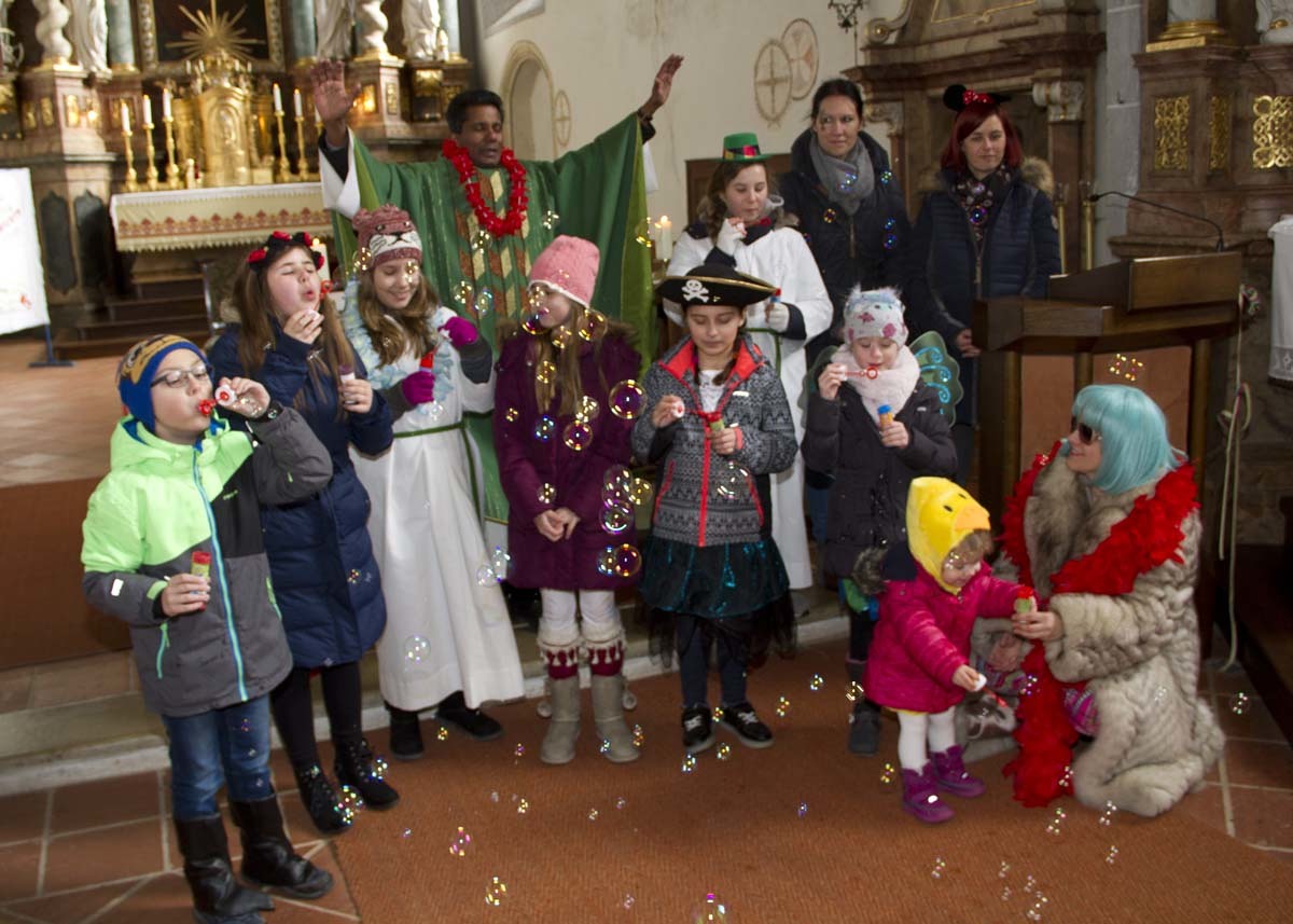 Bereits zum 2. Mal fand unsere Faschingsmesse statt. Mit den verkleideten Kindern wurde im Pfarrbüro gebastelt, gesungen und getanzt. Zu der Kommunion sind wir gemeinsam in die Kirche zurückgekehrt, wo wir unser einstudiertes Lied vorgesungen hatten. Nach dem Schlussgebet haben die Kinder Seifenblasen geblasen und Gedanken zum Fasching vorgetragen. Das lustige Fest ging mit dem anschließendem Pfarrkaffee zu Ende. Danke an Lady Gaga, dem Kücken, der Inuit, dem Schmetterling, der Piratin, dem Robin Hood und der La Catrina