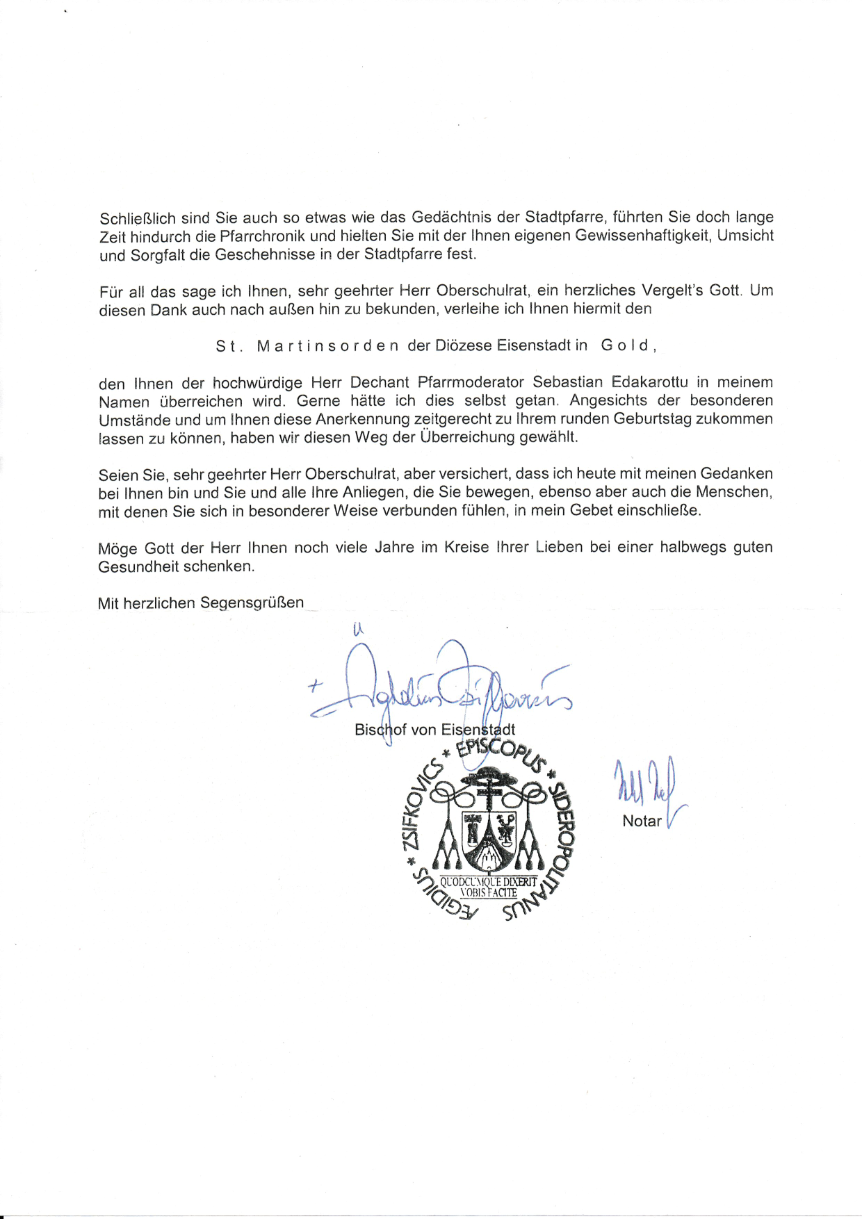Unten finden Sie ein paar Worte von Herrn Bischof Zsifkovics an Herrn OSR Paukovits.