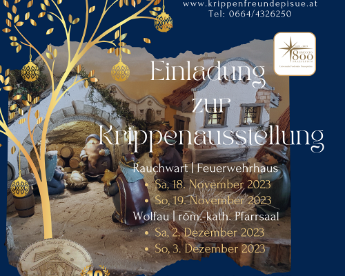 Beginn der Hl. Messe mit Ausstellungseröffnung und Krippensegnung am Samstag, 18. November 2023 ist um 9 Uhr. Die Ausstellung der selbstgebauten Krippen findet Samstag, 18. November und Sonntag, 19. November, je von 10 Uhr bis 17 Uhr im Feuerwehrhaus Rauchwart statt.
