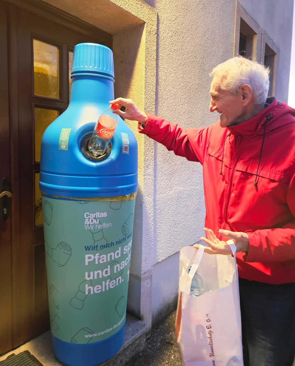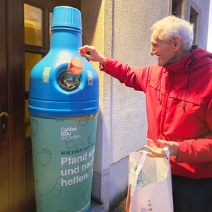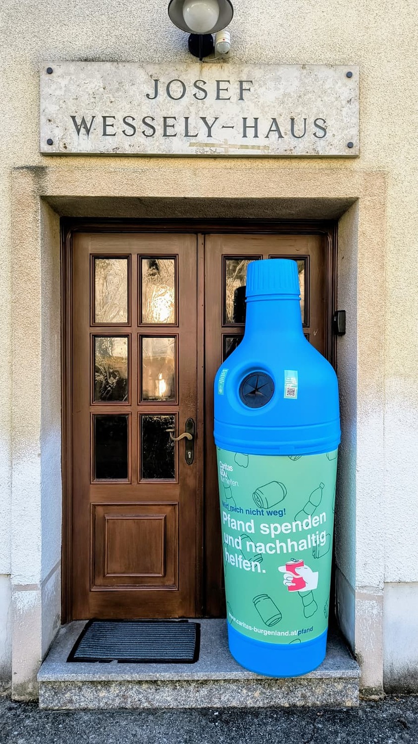 Seit November können beim Pfarrheim Josef Wessely Haus Pfandflaschen und -dosen zugunsten der Caritas gespendet werden. Der Sammelbehälter ist tagsüber aufgestellt: Vergelt's Gott für Ihre Spenden!