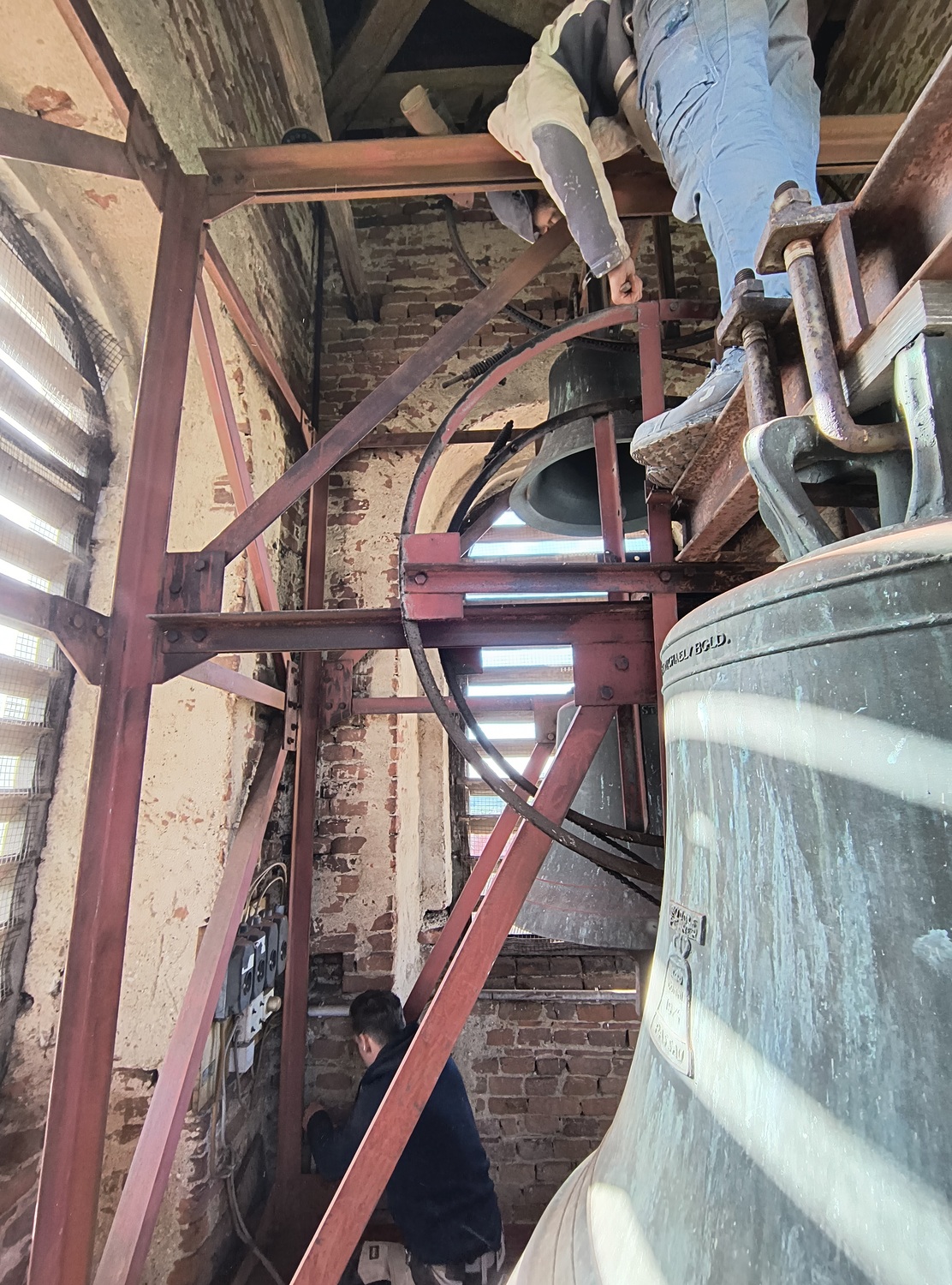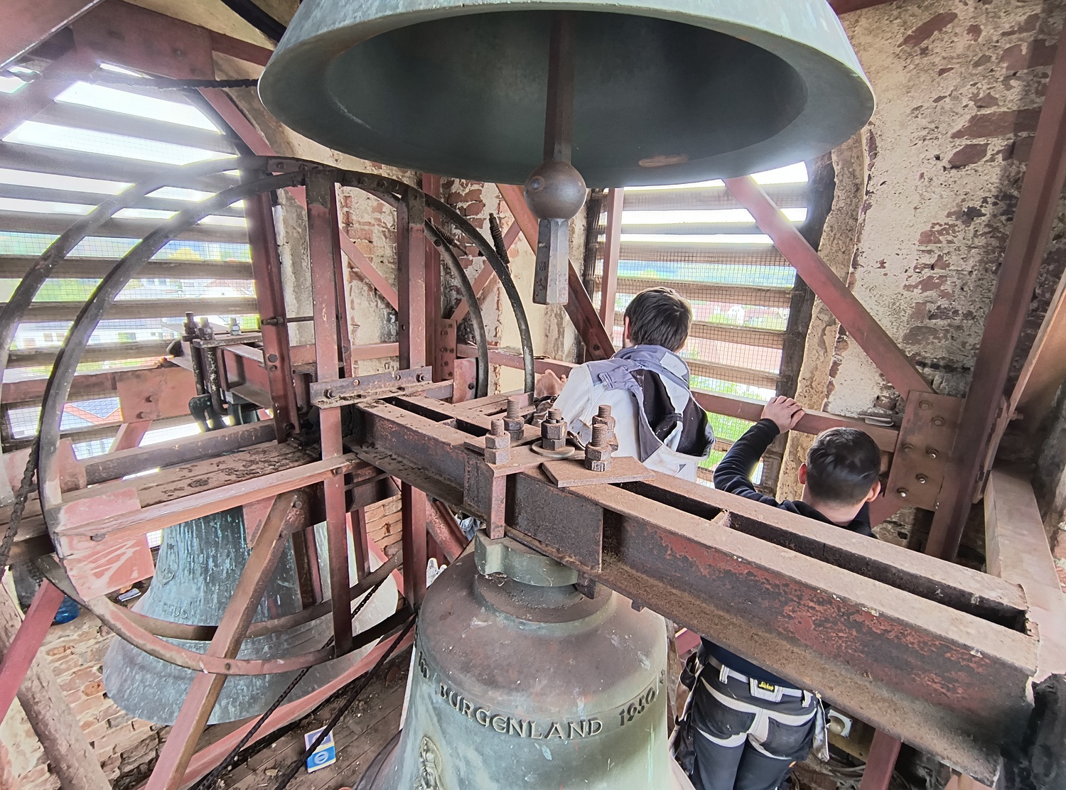 Am Montag, 20. April 2026 begannen die langersehnten Arbeiten im Glockenturm der Pfarrkirche St. Michael. Nach langer Vorbereitung in Zusammenarbeit mit den Fachfirmen sowie nach großer Spendenbereitschaft im Pfarrgebiet - und nach Frühlingsanbruch - gilt als erste Arbeit die Renovierung des eisernen Glockenstuhls. Pfarrer Josef Wesely selbst war am Aufbau tatkräftig beteiligt, dementsprechend hat über die Jahrzehnte jegliche Witterung ihre Spuren hinterlassen. Darum ist die erste langwierige Arbeit das Abschleifen von altem Lack und Rost, bevor der Glockenstuhl neu gestrichen werden kann. Diese Arbeiten werden von der ortsansässigen Fa. Malerei Ungur durchgeführt. Helfer sind bei mehreren Arbeiten möglich und gerne willkommen - bitte ggf. um Rückmeldung.