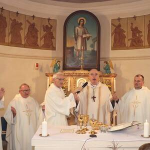 Ein großes Festzelt, das eigens für den Festgottesdienst aufgestellt worden ist und bereits am Nachmittag wieder zur Freigabe der Straße abgebaut war, wurde dank Videoübertragung zum erweiterten Kirchenraum, in dem zahlreiche Gläubige unseres Seelsorgeraums (und darüber hinaus) die Festmesse mitfeiern konnten und auch vor dem einsetzenden Regen geschützt waren. Trotz der langen Feier mit seiner Fülle an besonderen Riten ließen es sich viele nicht nehmen, noch zu einer Agape bei guter Stimmung zusammenzubleiben.