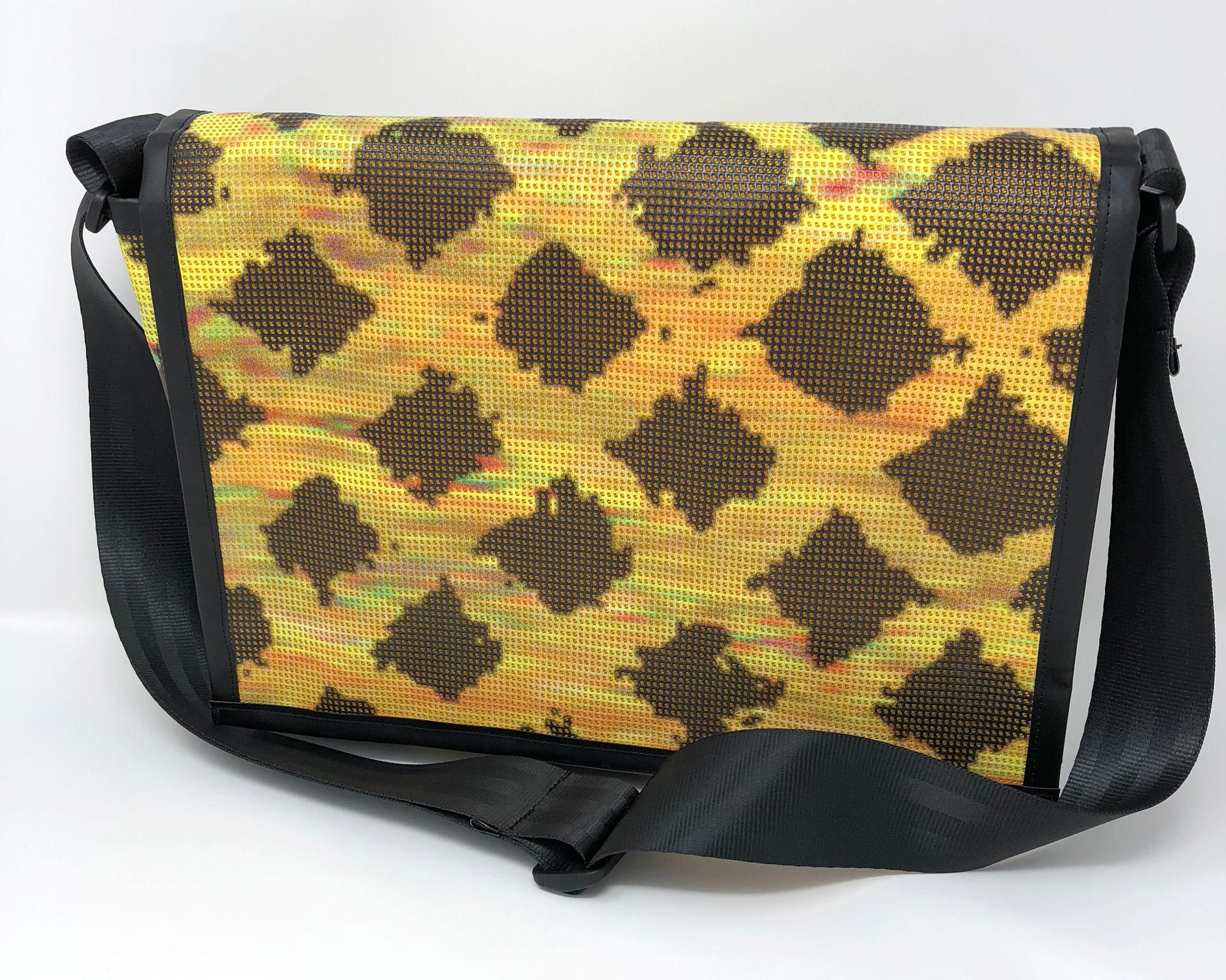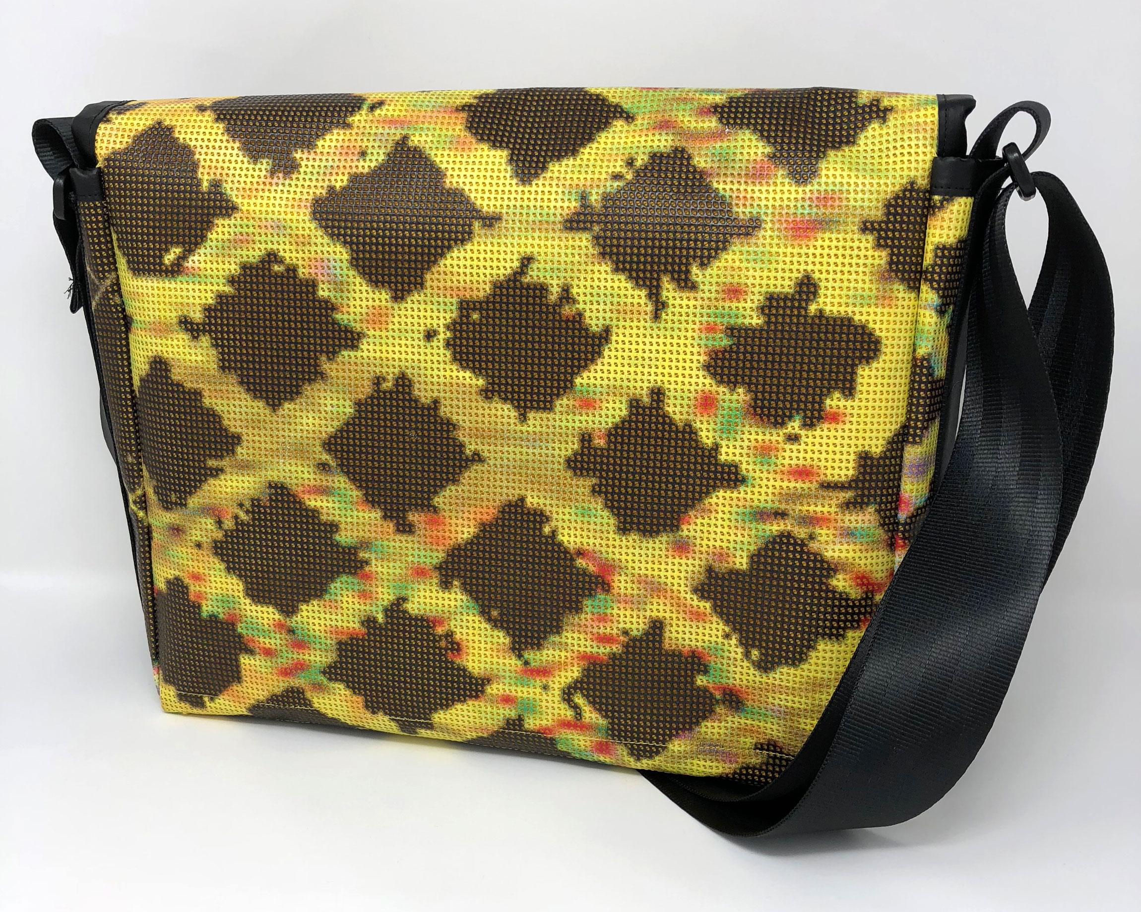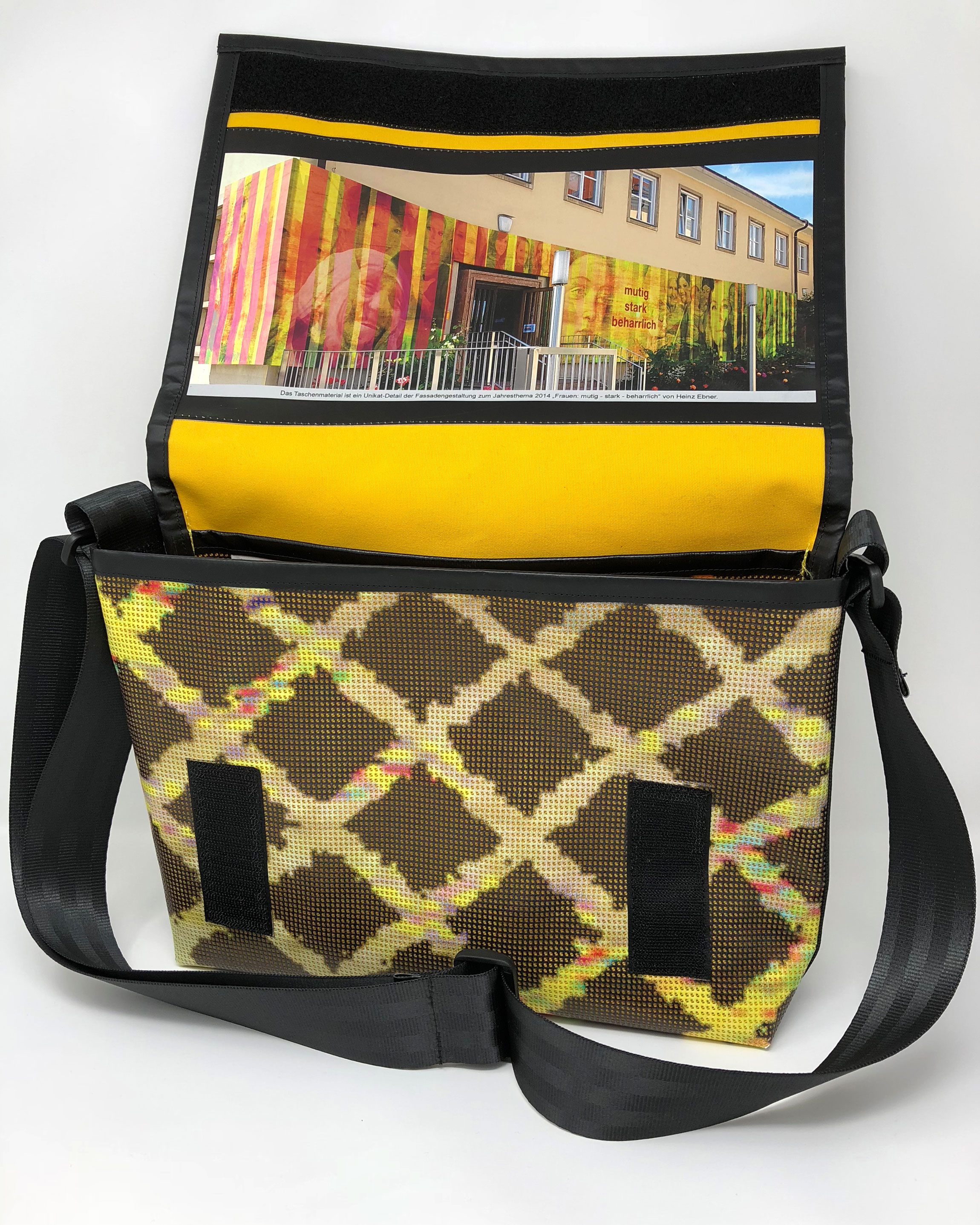 Laptop-Tasche aus PVC Mesh Netzvinyl mit Klettverschluss und Trageriemen. Auf der Innenseite des Taschendeckels ist eine Ansicht des Gesamtwerkes abgedruckt. Die Tasche besteht aus einem verstellbaren Tragegurt (Material: Autosicherheitsgurt), einer Innenfütterung und hat ein zusätzliches Innenfach.
