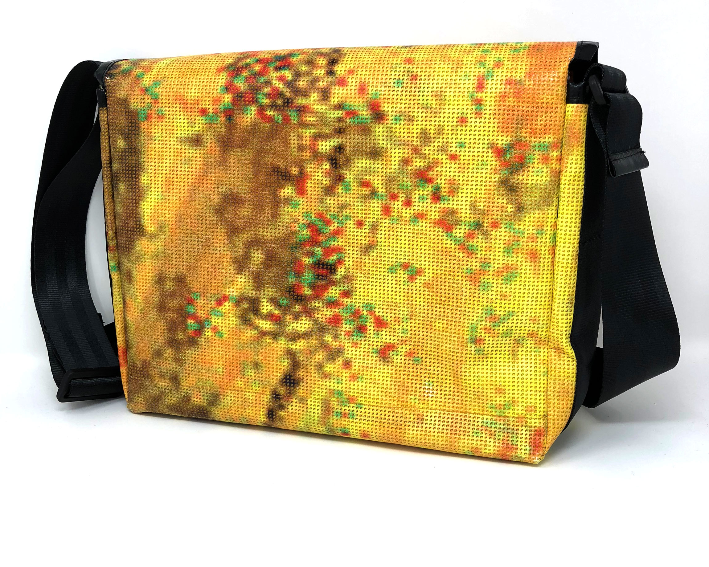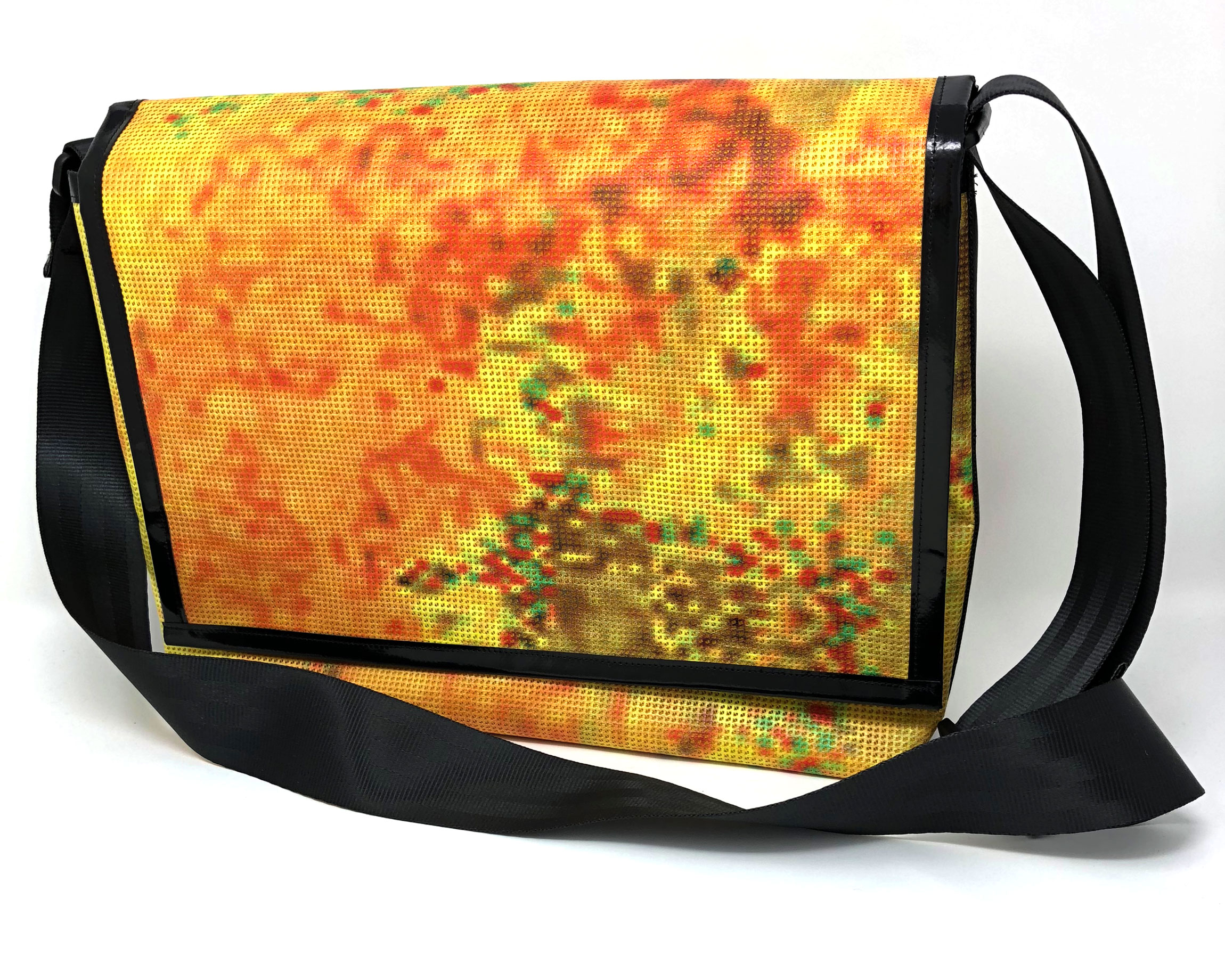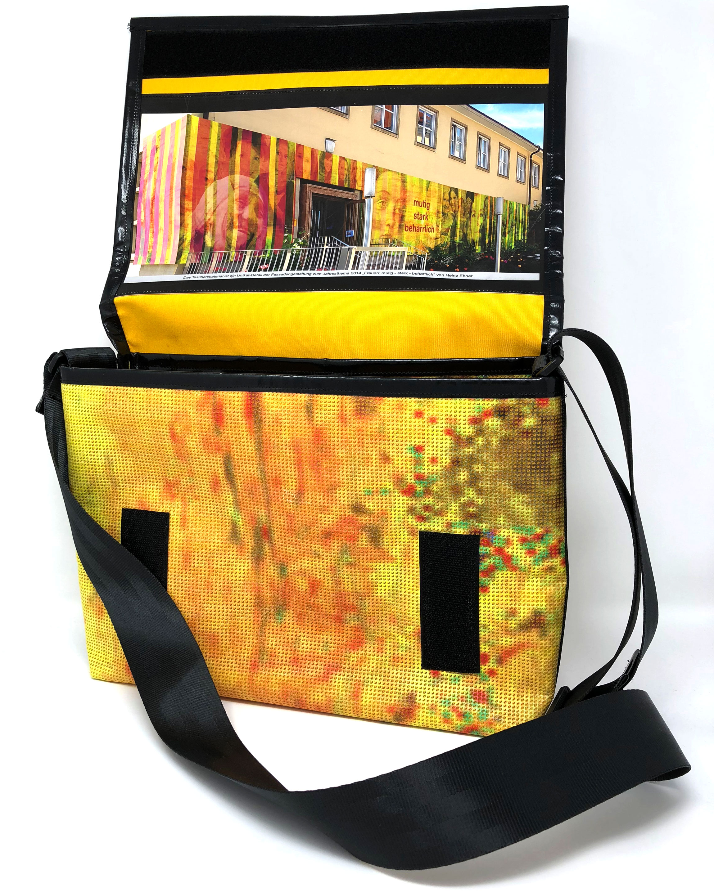 Laptop-Tasche aus PVC Mesh Netzvinyl mit Klettverschluss und Trageriemen. Auf der Innenseite des Taschendeckels ist eine Ansicht des Gesamtwerkes abgedruckt. Die Tasche besteht aus einem verstellbaren Tragegurt (Material: Autosicherheitsgurt), einer Innenfütterung und hat ein zusätzliches Innenfach.