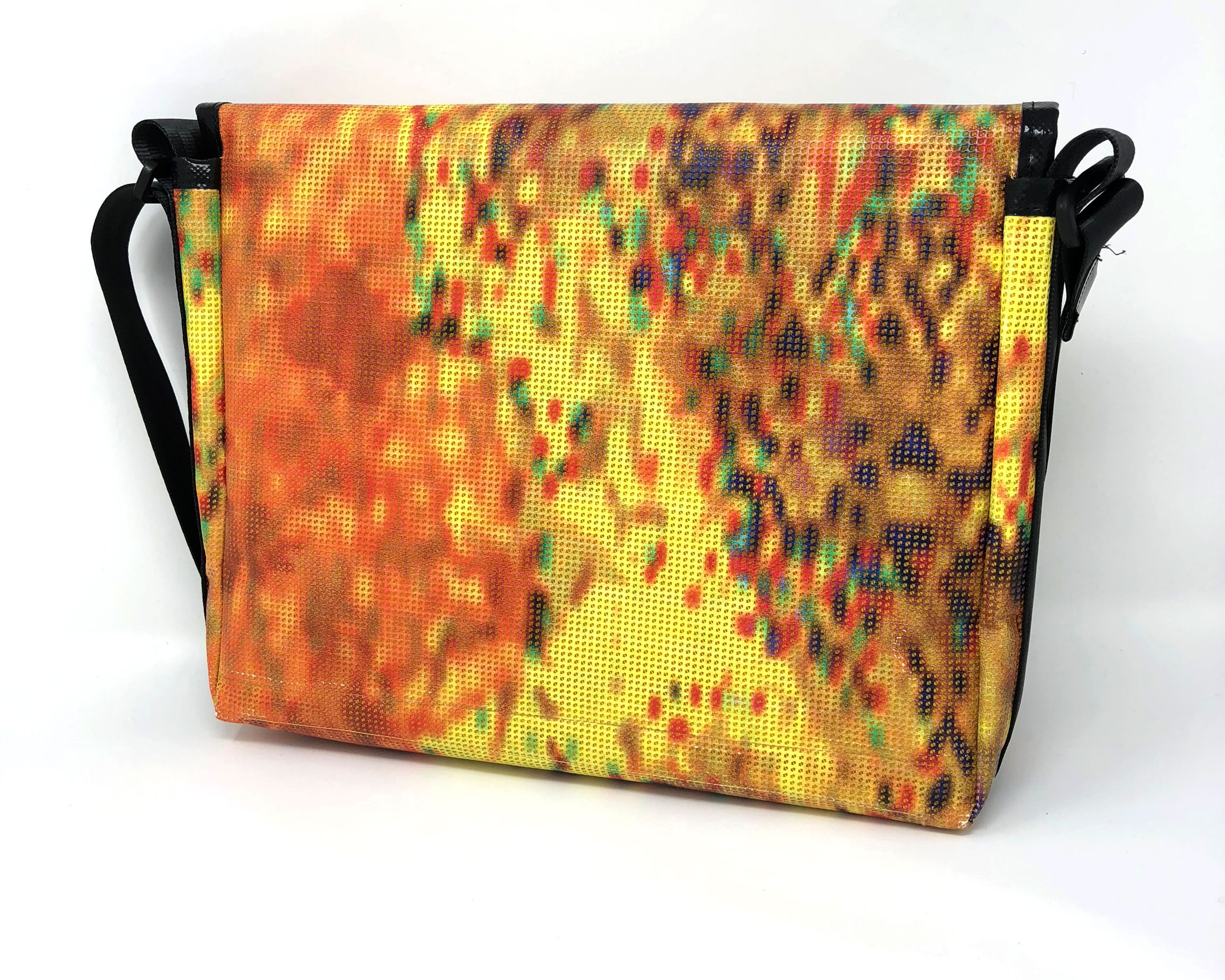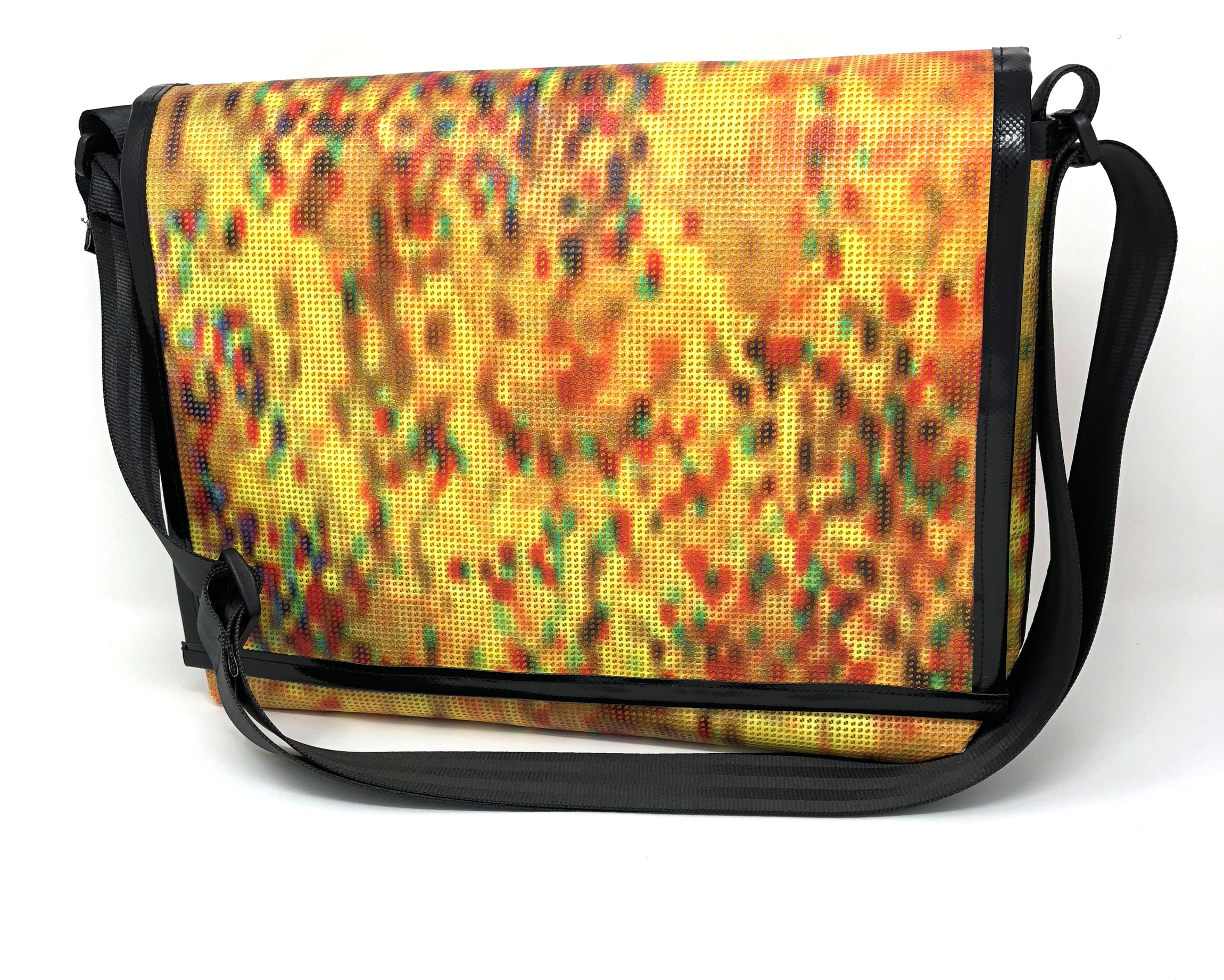 Laptop-Tasche aus PVC Mesh Netzvinyl mit Klettverschluss und Trageriemen. Auf der Innenseite des Taschendeckels ist eine Ansicht des Gesamtwerkes abgedruckt. Die Tasche besteht aus einem verstellbaren Tragegurt (Material: Autosicherheitsgurt), einer Innenfütterung und hat ein zusätzliches Innenfach.