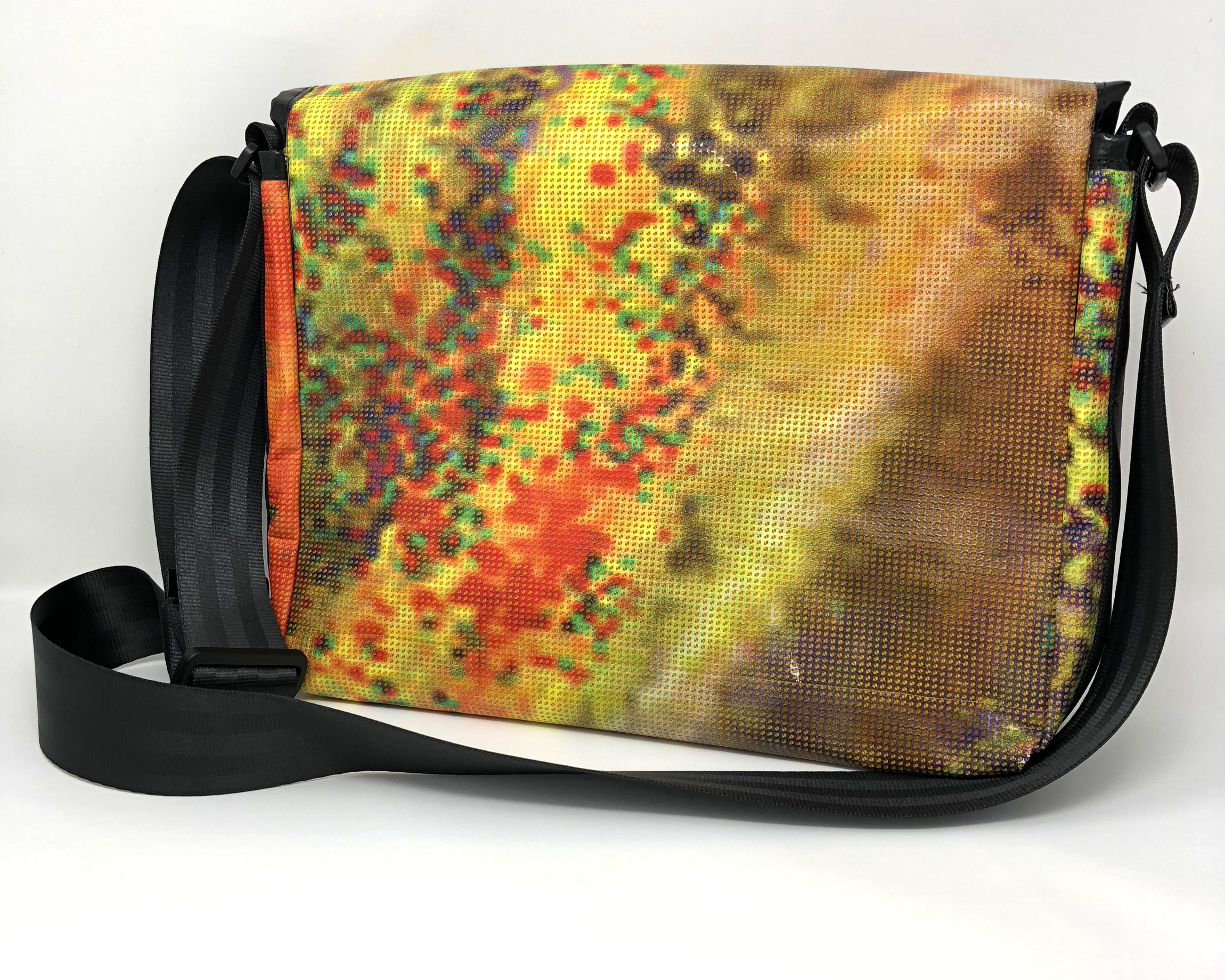 Laptop-Tasche aus PVC Mesh Netzvinyl mit Klettverschluss und Trageriemen. Auf der Innenseite des Taschendeckels ist eine Ansicht des Gesamtwerkes abgedruckt. Die Tasche besteht aus einem verstellbaren Tragegurt (Material: Autosicherheitsgurt), einer Innenfütterung und hat ein zusätzliches Innenfach.