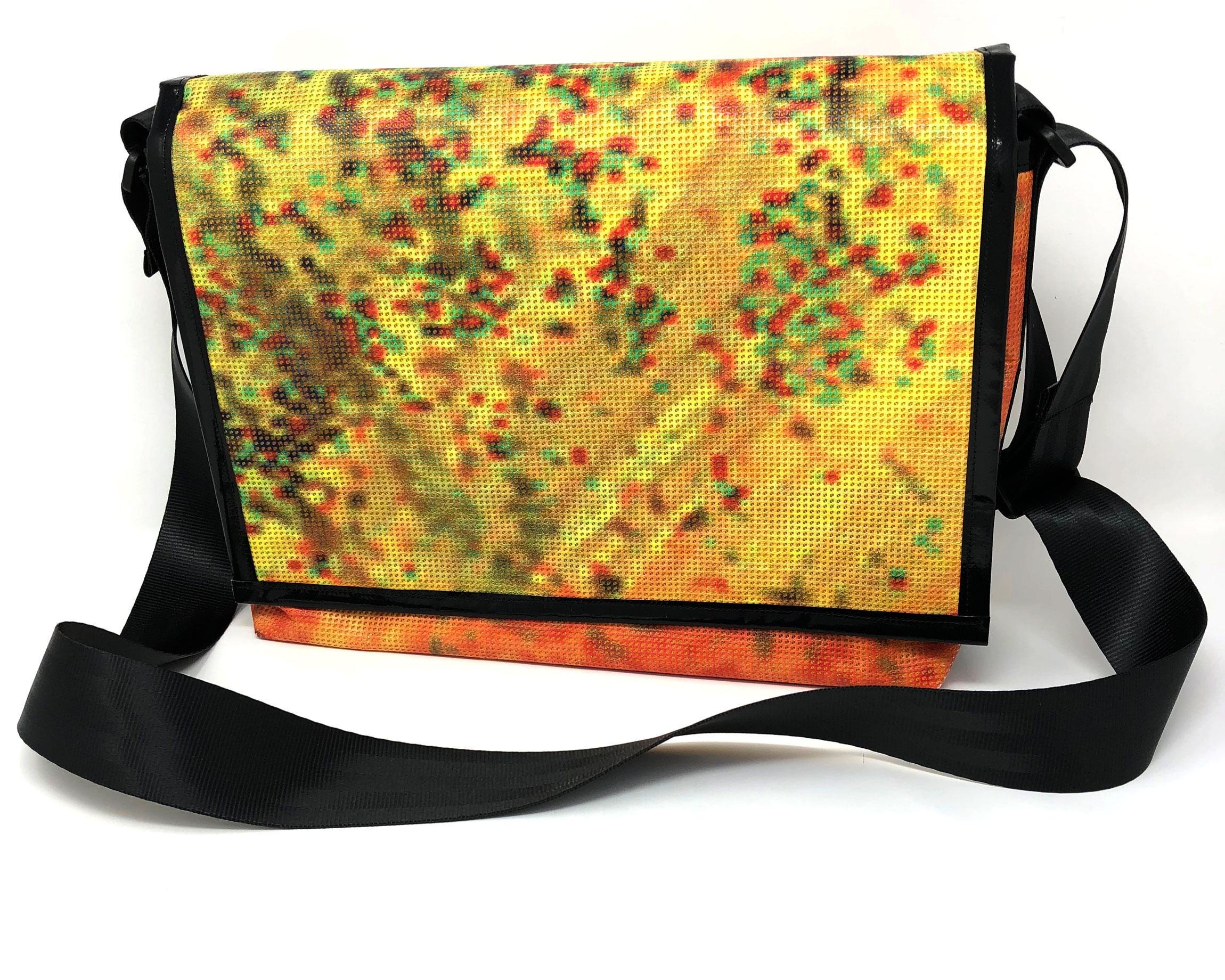 Laptop-Tasche aus PVC Mesh Netzvinyl mit Klettverschluss und Trageriemen. Auf der Innenseite des Taschendeckels ist eine Ansicht des Gesamtwerkes abgedruckt. Die Tasche besteht aus einem verstellbaren Tragegurt (Material: Autosicherheitsgurt), einer Innenfütterung und hat ein zusätzliches Innenfach.