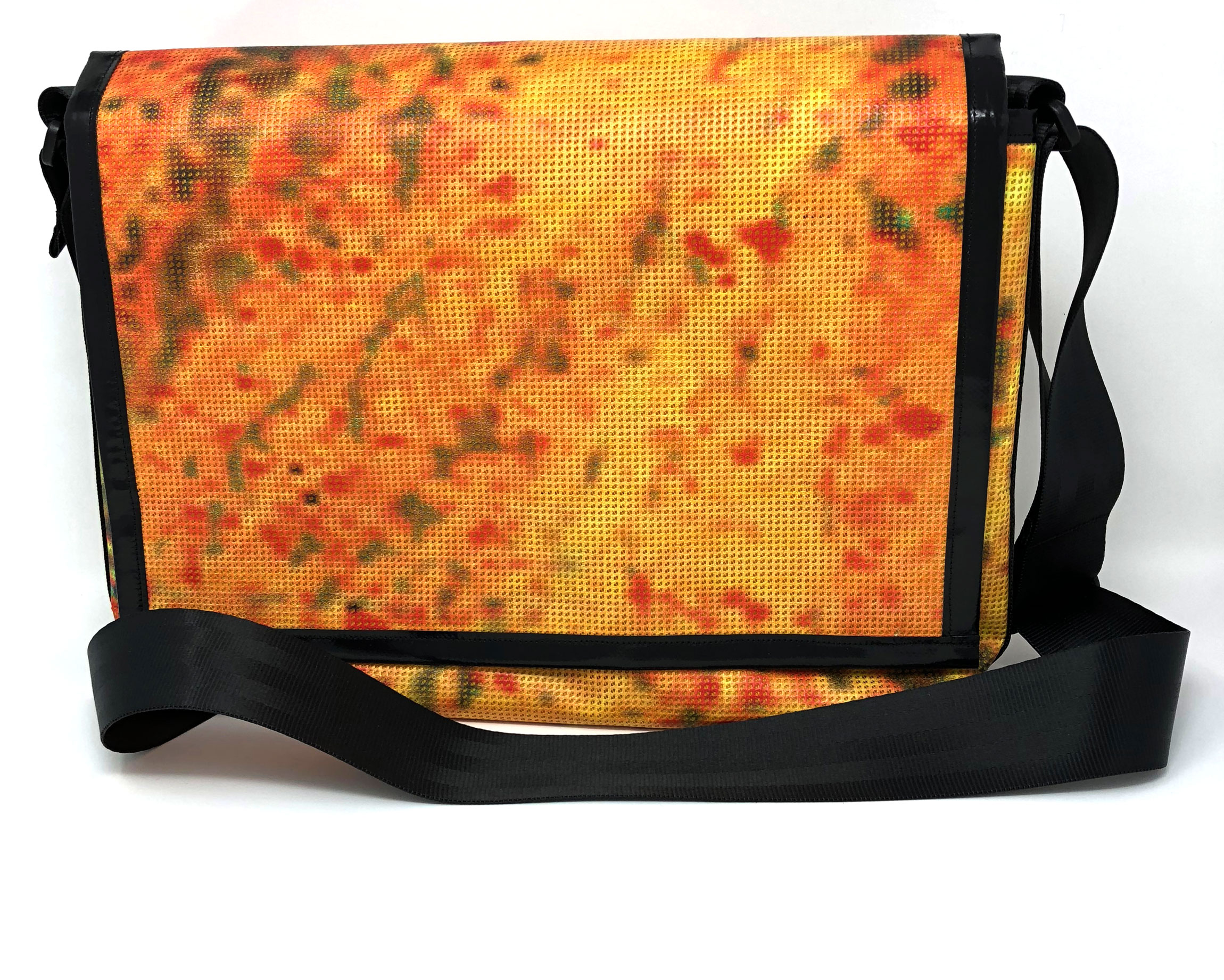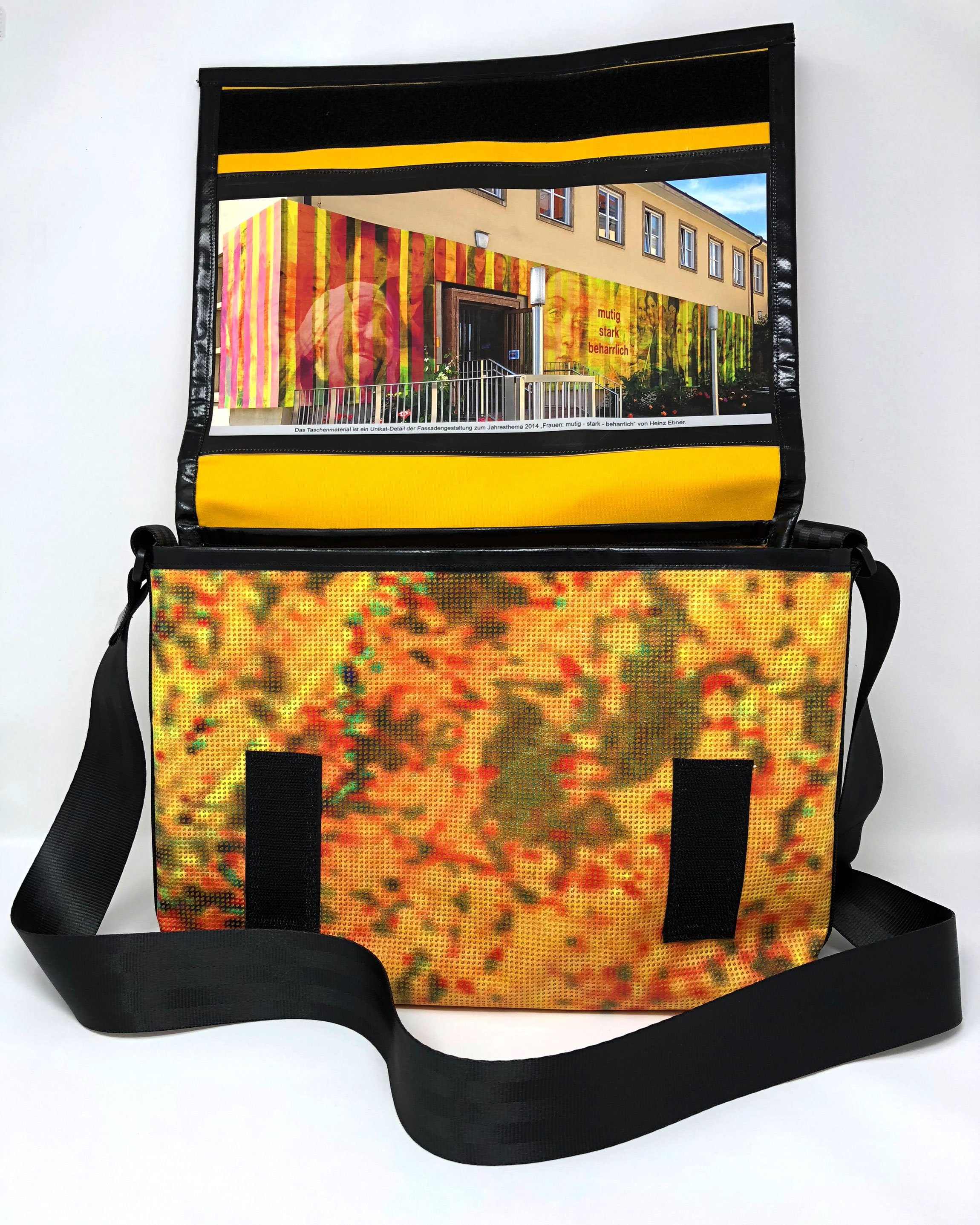 Laptop-Tasche aus PVC Mesh Netzvinyl mit Klettverschluss und Trageriemen. Auf der Innenseite des Taschendeckels ist eine Ansicht des Gesamtwerkes abgedruckt. Die Tasche besteht aus einem verstellbaren Tragegurt (Material: Autosicherheitsgurt), einer Innenfütterung und hat ein zusätzliches Innenfach.