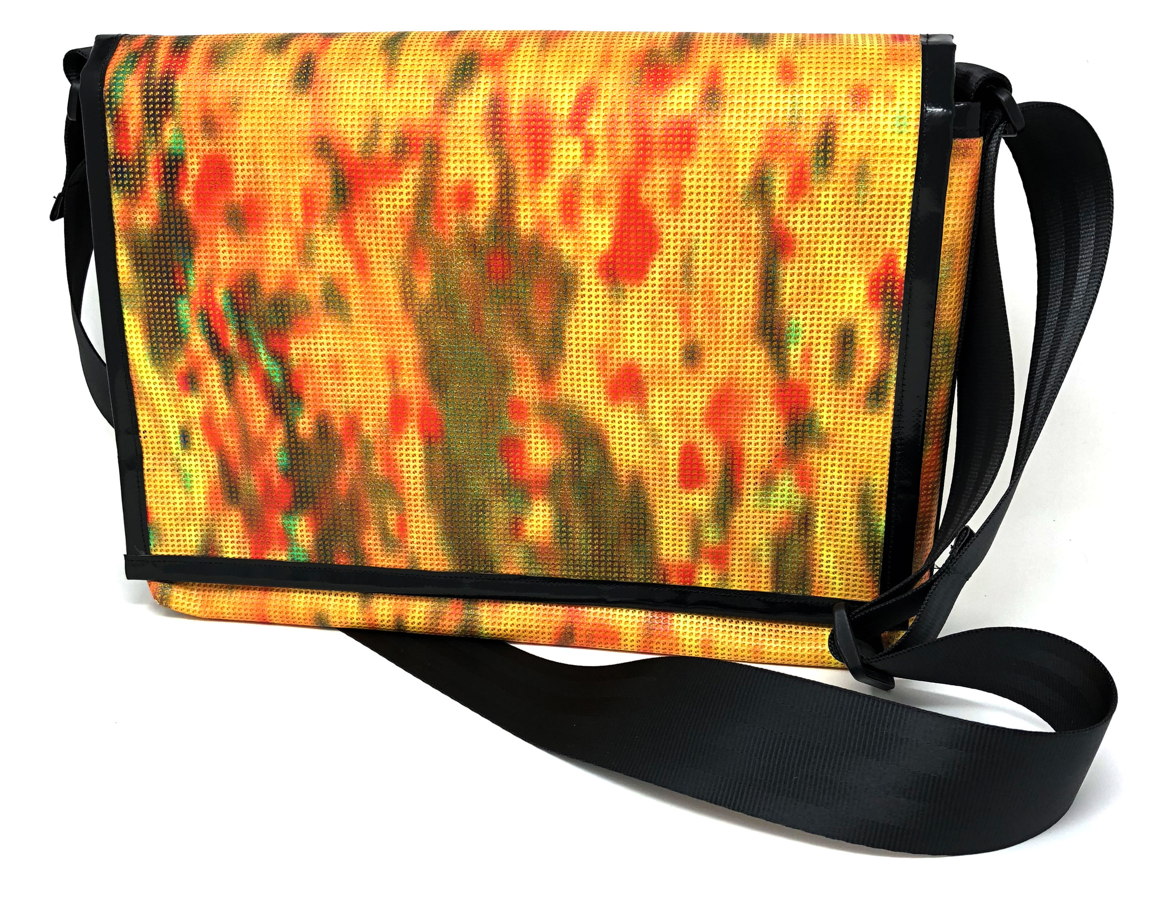 Laptop-Tasche aus PVC Mesh Netzvinyl mit Klettverschluss und Trageriemen. Auf der Innenseite des Taschendeckels ist eine Ansicht des Gesamtwerkes abgedruckt. Die Tasche besteht aus einem verstellbaren Tragegurt (Material: Autosicherheitsgurt), einer Innenfütterung und hat ein zusätzliches Innenfach.