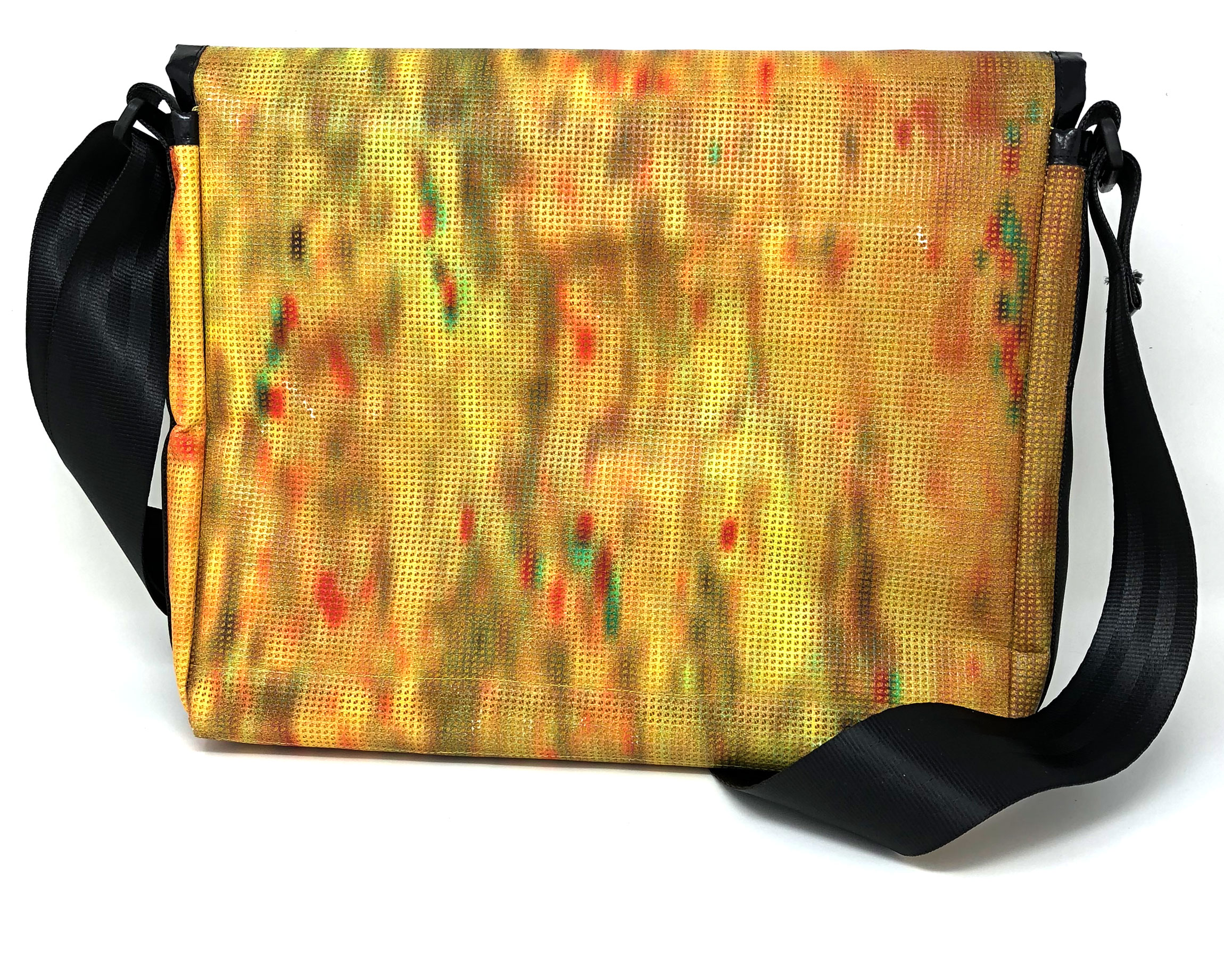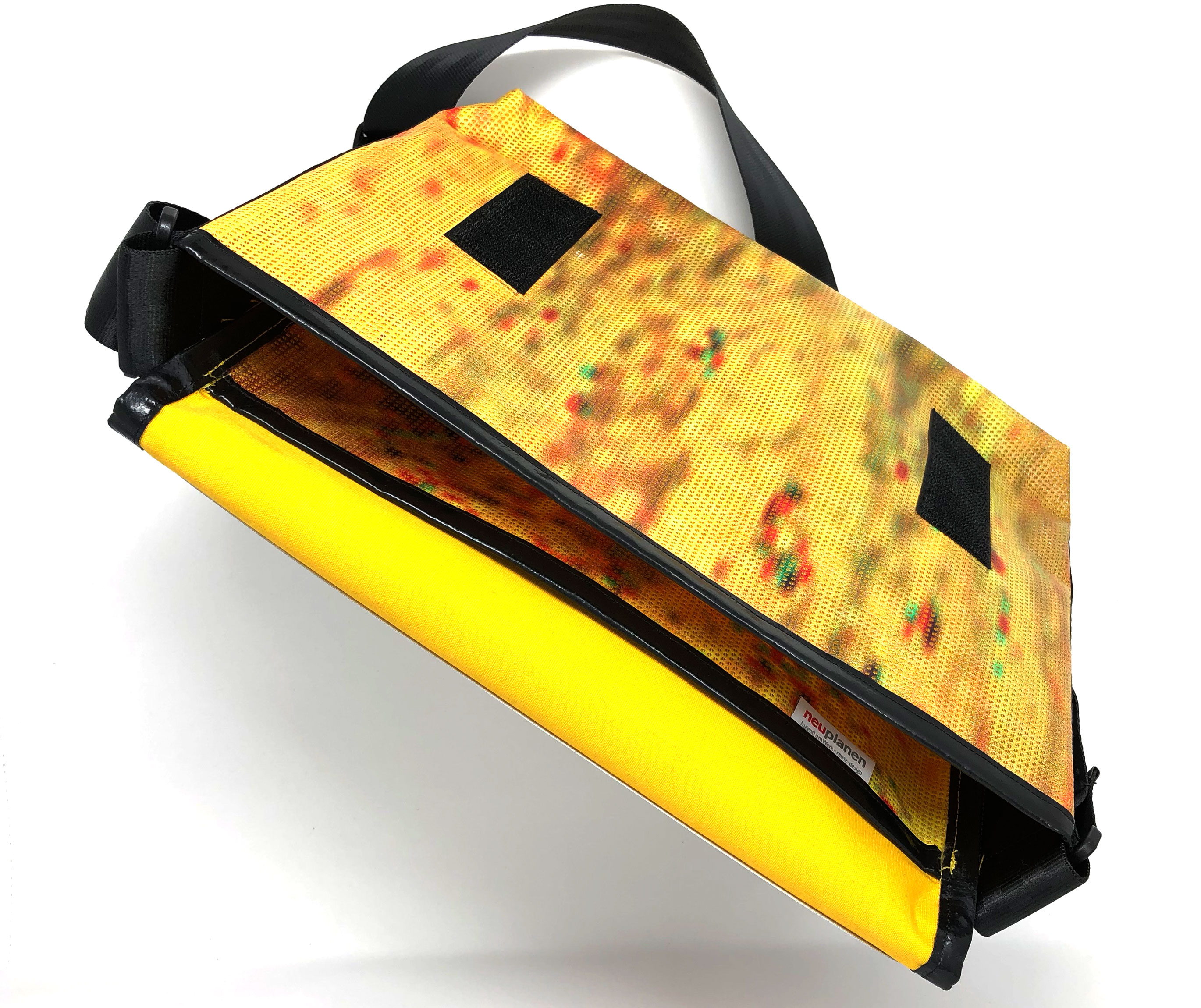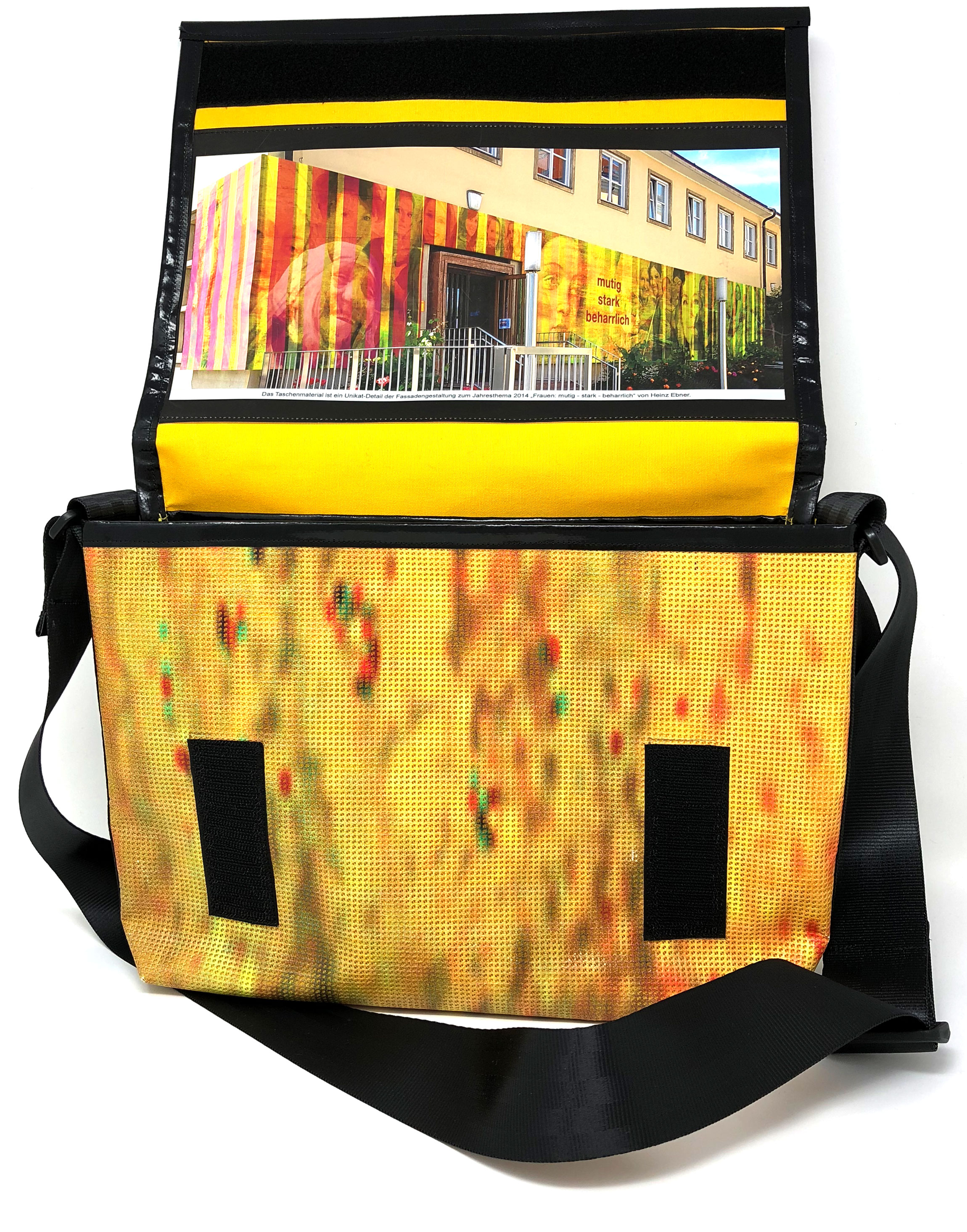 Laptop-Tasche aus PVC Mesh Netzvinyl mit Klettverschluss und Trageriemen. Auf der Innenseite des Taschendeckels ist eine Ansicht des Gesamtwerkes abgedruckt. Die Tasche besteht aus einem verstellbaren Tragegurt (Material: Autosicherheitsgurt), einer Innenfütterung und hat ein zusätzliches Innenfach.
