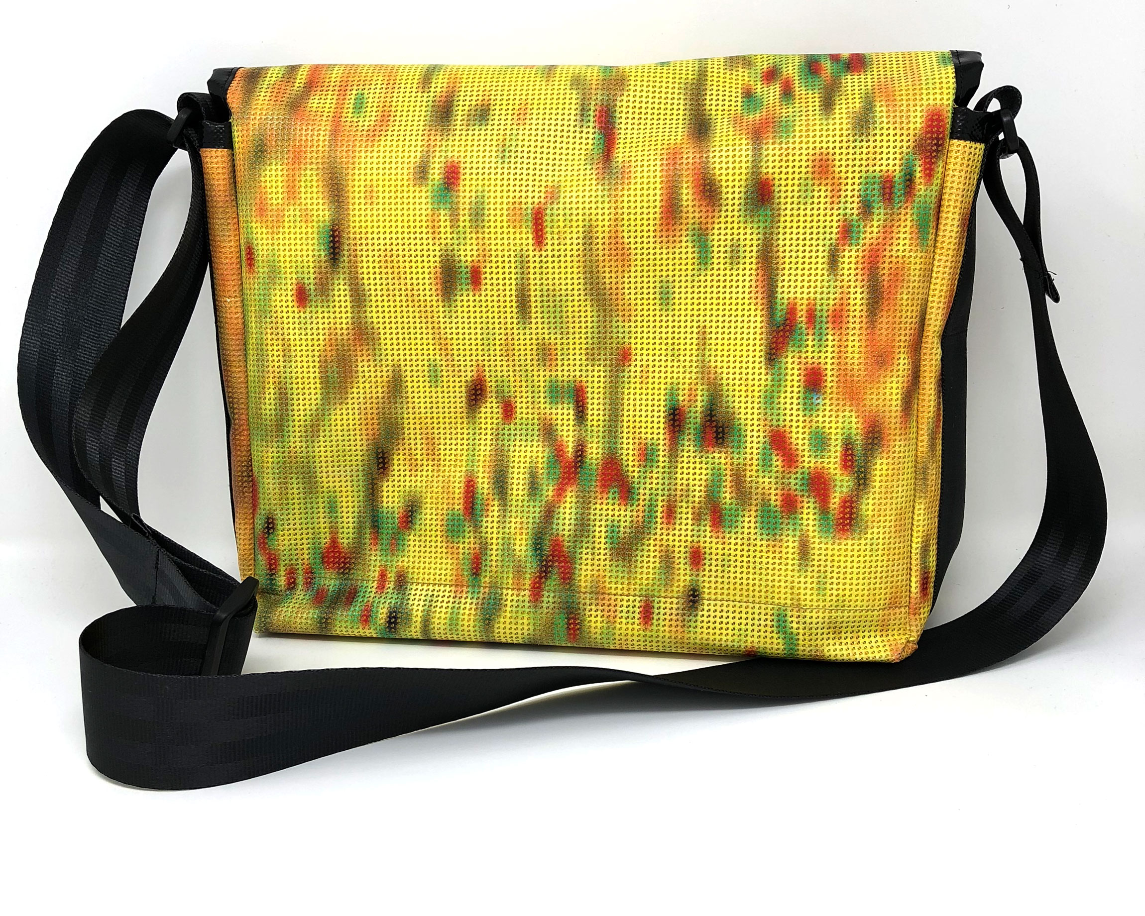Laptop-Tasche aus PVC Mesh Netzvinyl mit Klettverschluss und Trageriemen. Auf der Innenseite des Taschendeckels ist eine Ansicht des Gesamtwerkes abgedruckt. Die Tasche besteht aus einem verstellbaren Tragegurt (Material: Autosicherheitsgurt), einer Innenfütterung und hat ein zusätzliches Innenfach.