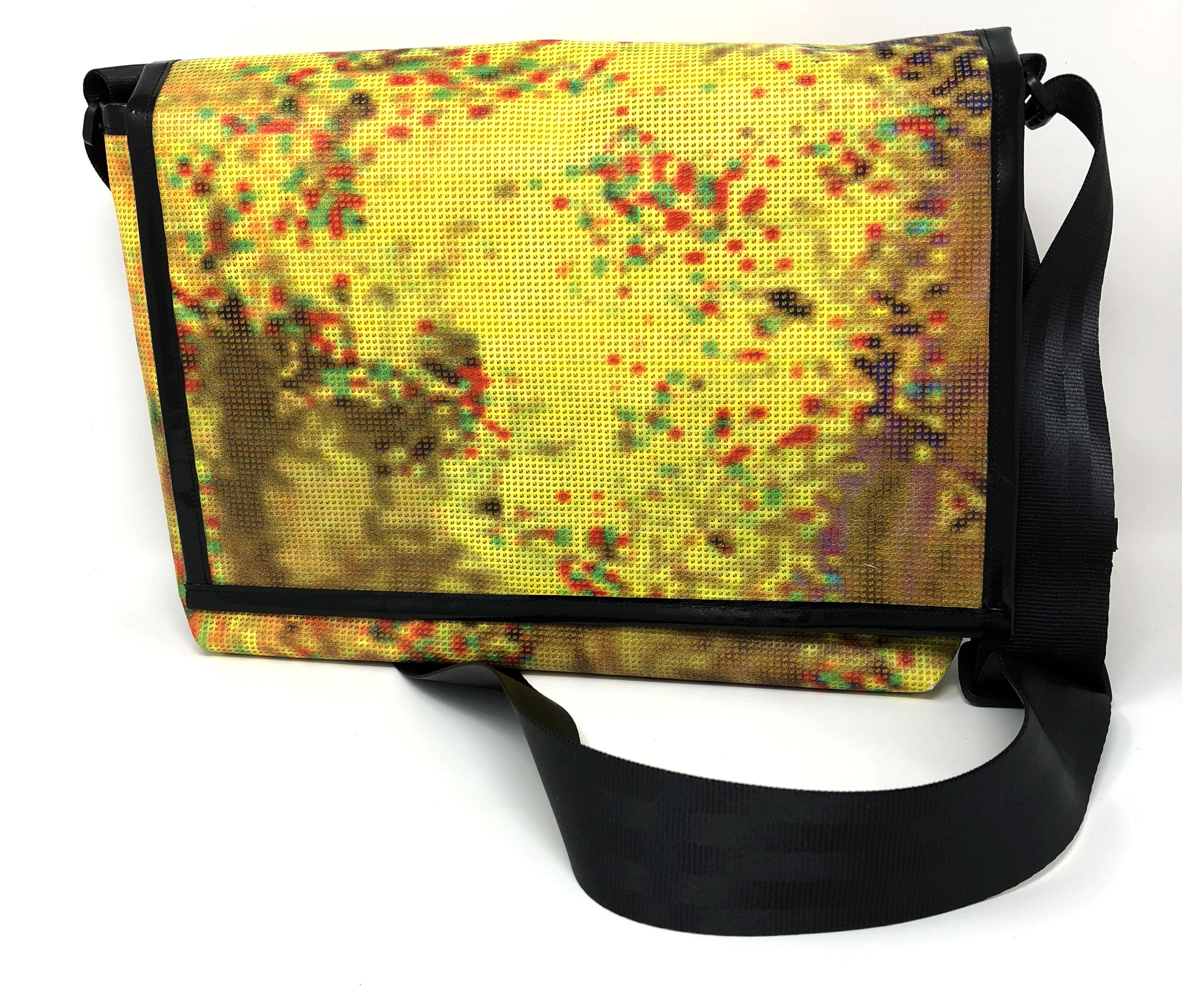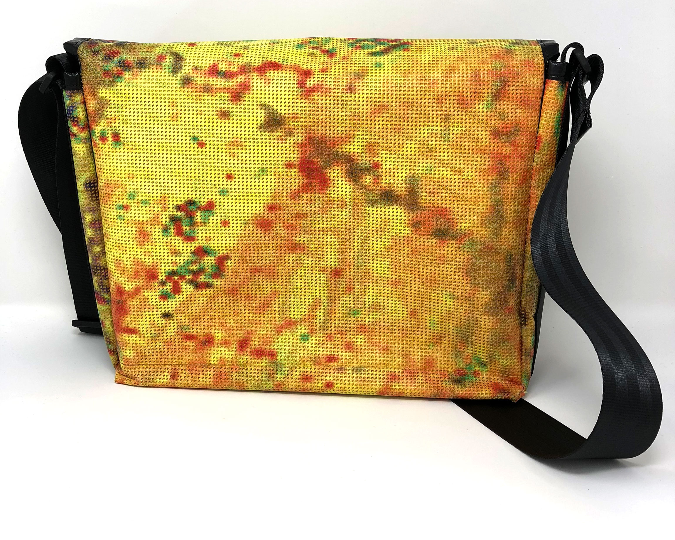 Laptop-Tasche aus PVC Mesh Netzvinyl mit Klettverschluss und Trageriemen. Auf der Innenseite des Taschendeckels ist eine Ansicht des Gesamtwerkes abgedruckt. Die Tasche besteht aus einem verstellbaren Tragegurt (Material: Autosicherheitsgurt), einer Innenfütterung und hat ein zusätzliches Innenfach.