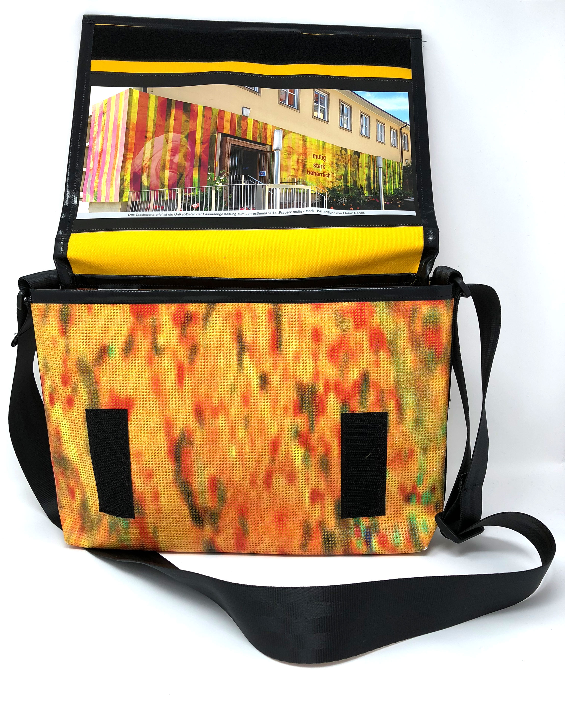 Laptop-Tasche aus PVC Mesh Netzvinyl mit Klettverschluss und Trageriemen. Auf der Innenseite des Taschendeckels ist eine Ansicht des Gesamtwerkes abgedruckt. Die Tasche besteht aus einem verstellbaren Tragegurt (Material: Autosicherheitsgurt), einer Innenfütterung und hat ein zusätzliches Innenfach.