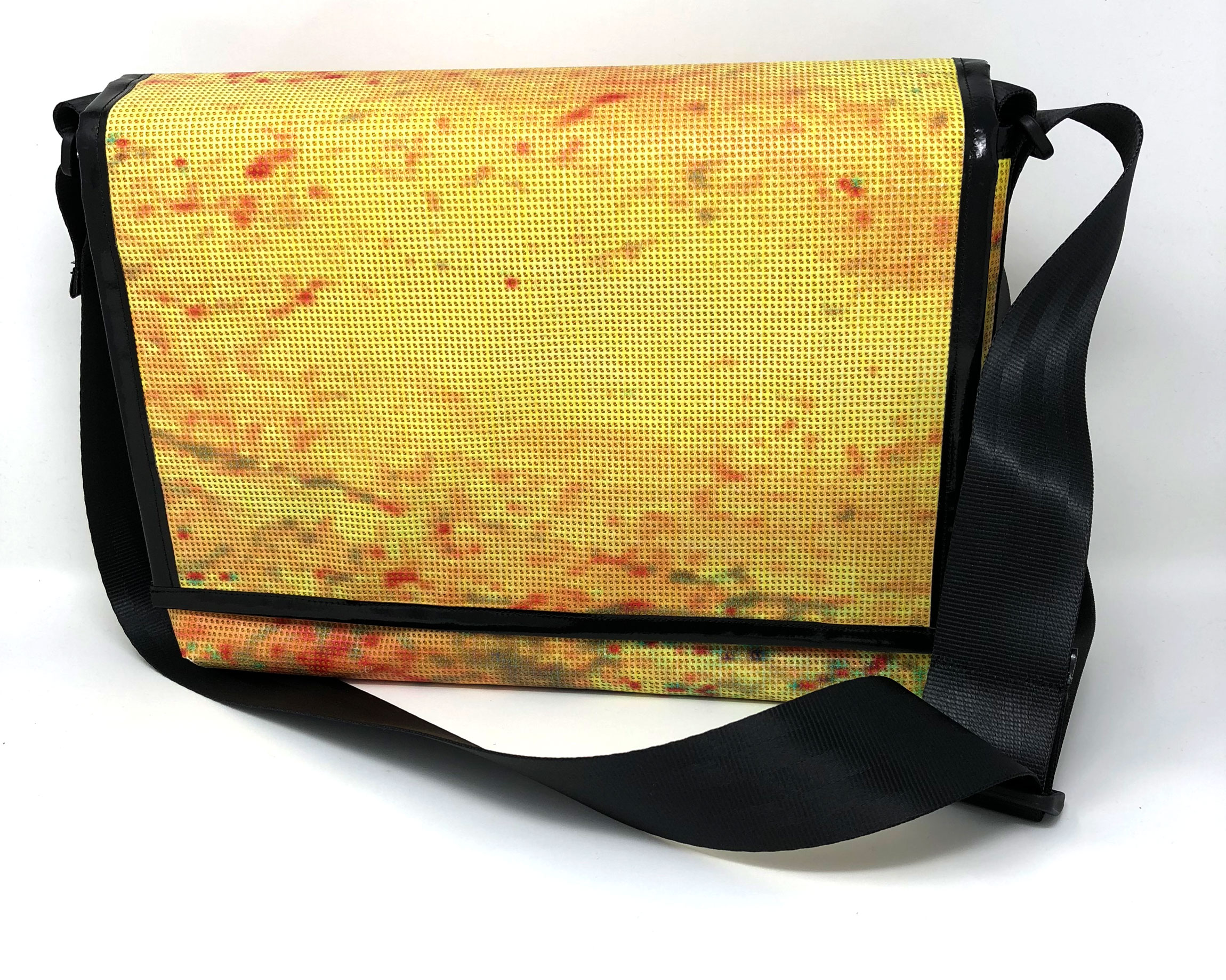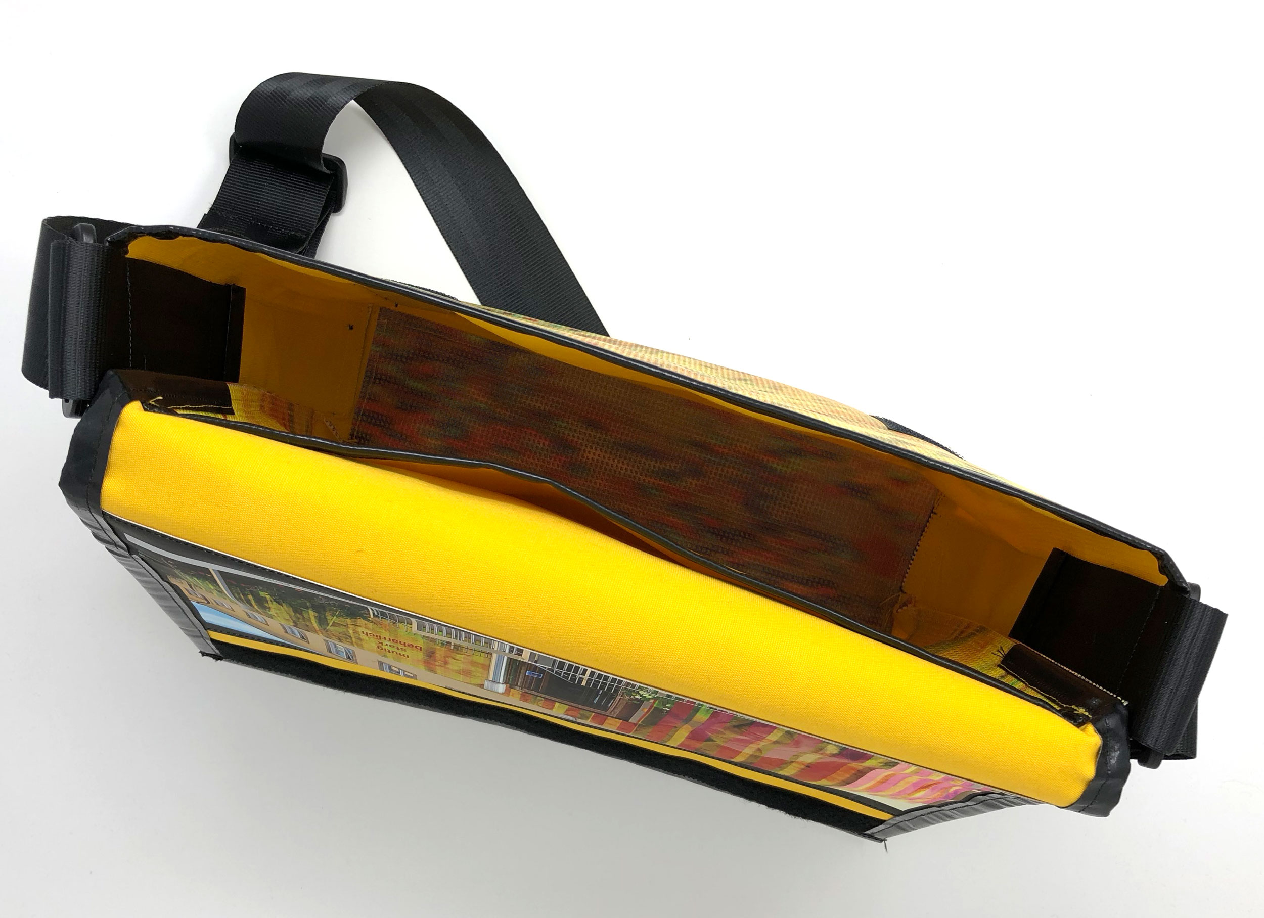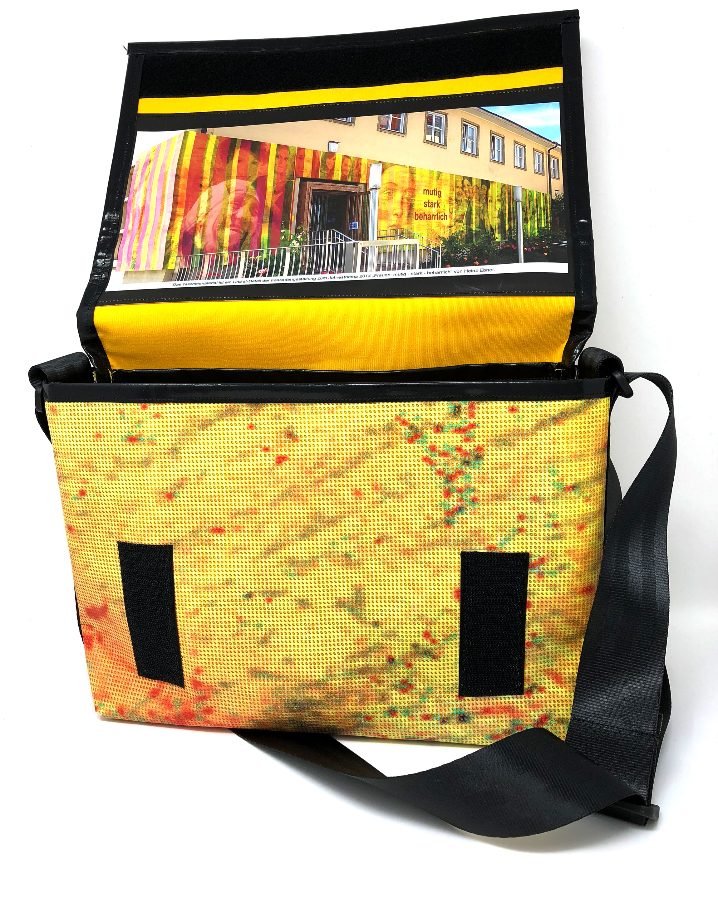 Laptop-Tasche aus PVC Mesh Netzvinyl mit Klettverschluss und Trageriemen. Auf der Innenseite des Taschendeckels ist eine Ansicht des Gesamtwerkes abgedruckt. Die Tasche besteht aus einem verstellbaren Tragegurt (Material: Autosicherheitsgurt), einer Innenfütterung und hat ein zusätzliches Innenfach.