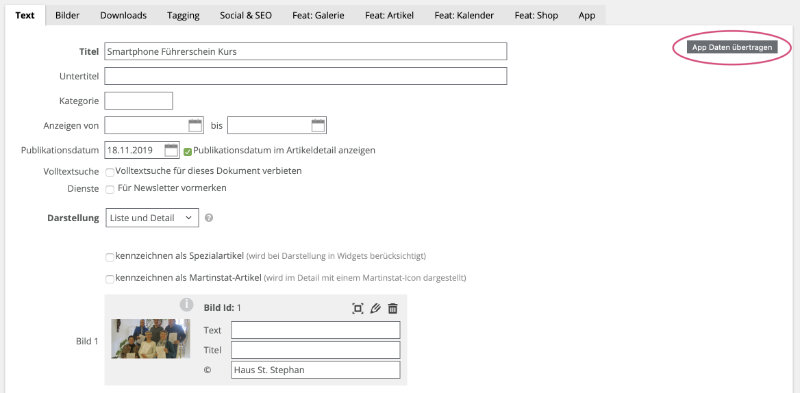 - Kopieren Sie mit dem Button "App Daten übertragen" die Textfelder des Artikels in die App-Felder.