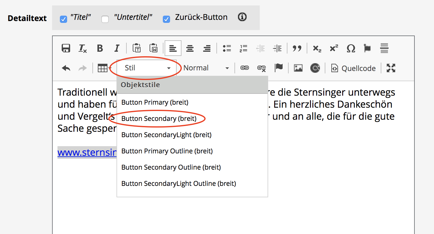 - Bitte verwenden Sie nicht den ersten Butten-Stil (Button Primary (breit)). Dieser soll für diözesane Artikel vorbehalten bleiben.